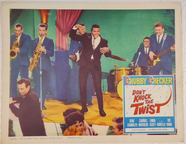 Don't Knock the Twist (Columbia Pictures, 1962) lobby card. Musical. Starring Chubby Checker, Gene Chandler, Vic Dana, Linda Scott, The Carroll Bros, The Dovells. Directed by Oscar Rudolph. Minor edge wear, minor creases, some stains. Very Fine. (11"x14").