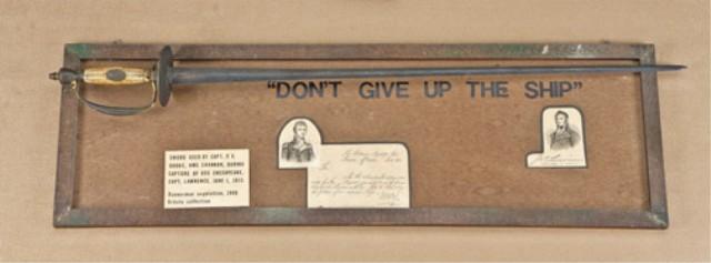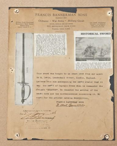 “Don’t give up the ship!” The immortal last words uttered by Captain Lawrence off Boston Harbor, June 1st 1830 in a famous naval battle between the American Frigate Chesapeake and the British Frigate Shannon, commanded by Captain P.B. Broke. This sword is the exact sword worn by Captain Broke while commanding the Shannon when he captured the American Frigate Chesapeake. The sword is pictured in the January 1927 Bannerman catalog at item number 3026. Also a notarized affidavit on Bannerman’s stationary states “This sword was bought by us about 1908 from our agent Mr. M. Levin, Leadenhall St. London, England. Letters from him accompanying [sic] the sword stated that it was the sword of Captain Broke when he commanded the frigate “SHANNON”. We remember the arrival of the sword here and the correspondence concerning it. We vouch for the printed catalog description.” Signed Francis Bannerman Sons, Francis Bannerman. Notarized 7 January, 1946. Physical Description: The sword measures approx. 38-3/4” overall, with 31-3/8” blade. The hilt is gold gilted over brass. The grips fluted ivory with plaque hand-engraved showing British crown