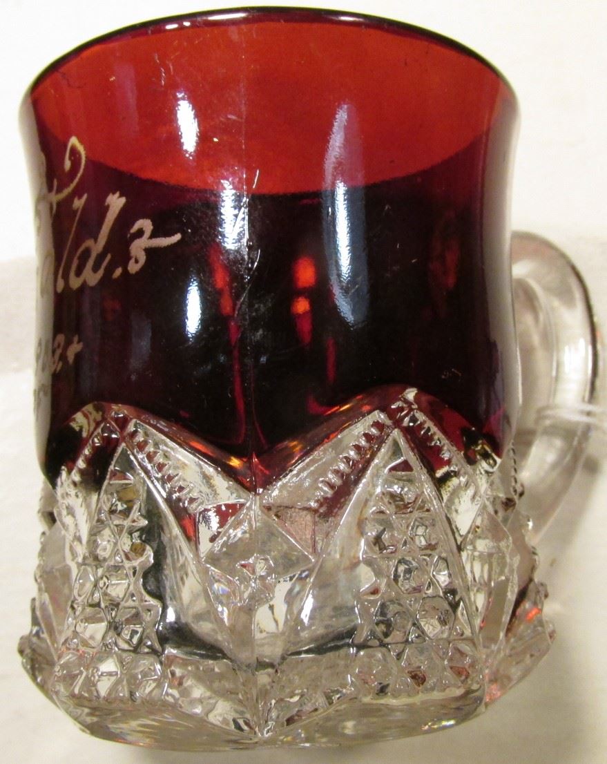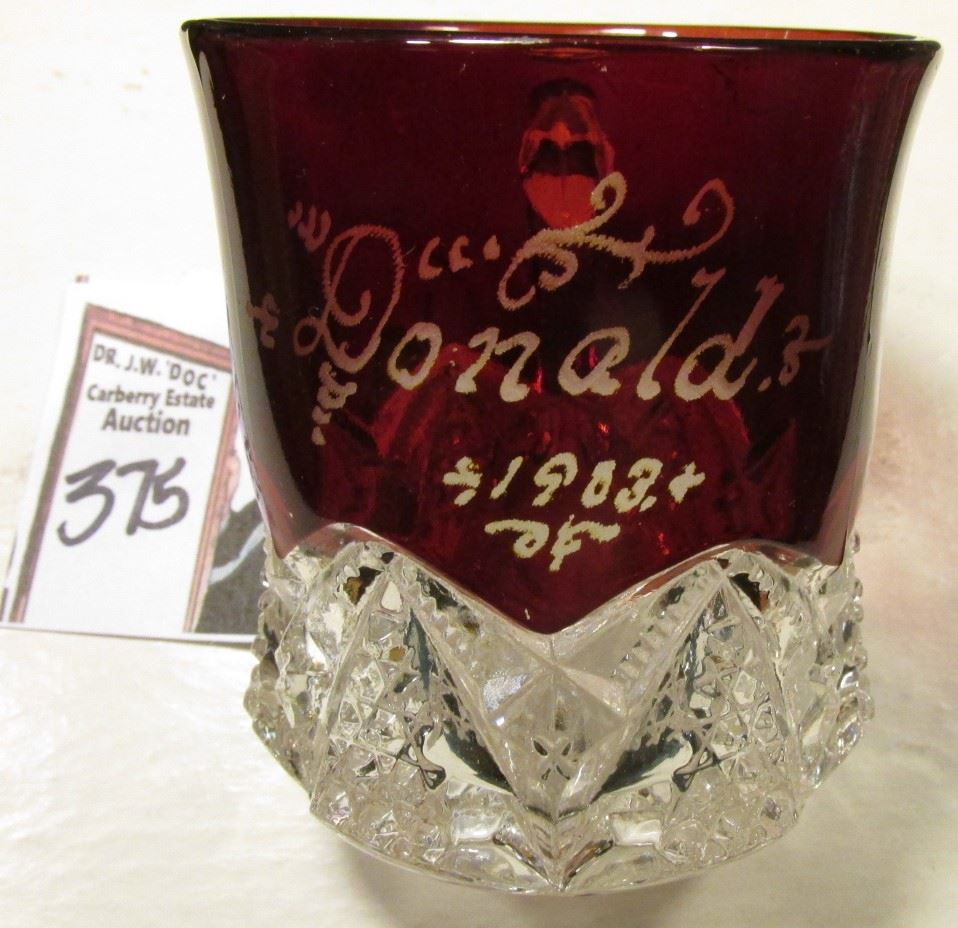 "Donald 1903 R"uby Red Flash Toothpick holder/childs mug. In nice condition and measures approximately 2 1/2" tall.