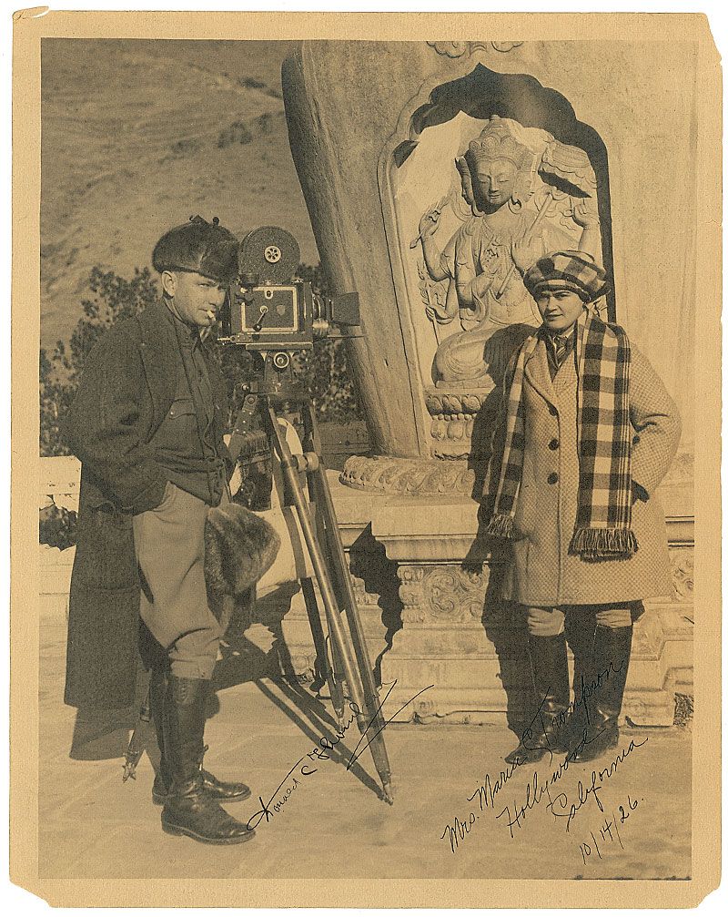 Cinematographer who was last known to be photographing in Ethiopia in 1936. Vintage matte-finish 11 x 14 photo of Thompson filming his wife in front of an ornate Asian carving, signed in black ink, “Donald C. Thompson,” and also signed by his wife, “Mrs. Maria S. Thompson, Hollywood, California, 10/14/26.” In fine condition, with three missing corner tips and a small tear to right edge.
