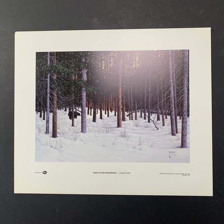 Donald Curley's "Edge of the Wilderness" Open Edition Print. A black bear in the forest, searching for his next meal. This print is in excellent condition.