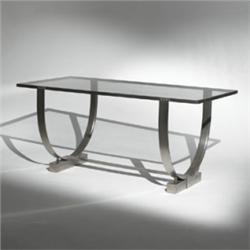 Donald Deskey dining table Deskey-Vollmer, Inc. USA, 1927-1931 nickel plated steel, glass 65.5"w x 30.5"d x 30"h Deskey modeled this design on a Emile-Jacques Ruhlmann table he viewed at the Paris Exposition of 1925. Deskey used this design in many of his most important interiors including Radio City Music Hall. Literature: Donald Deskey: Decorative Designs and Interiors, Hanks, pg.40 illustrates a similar example