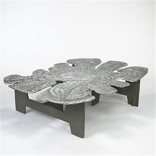 Donald Drumm coffee table Donald Drumm Studios USA, c. 1967 cast aluminum 45"w x 62"d x 15"h Two inscribed signatures to underside of tabletop: [Drumm].