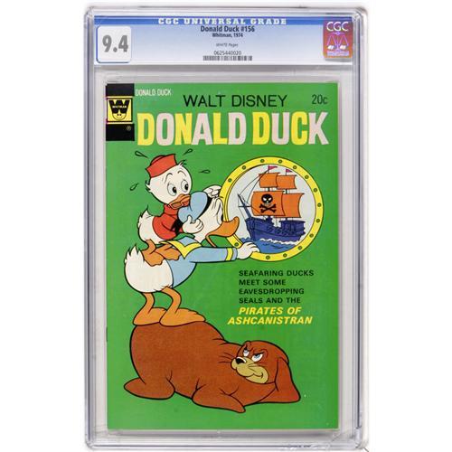<B>Donald Duck #156 (Whitman, 1974) CGC NM 9.4 White pages.</B></I> Whitman variant. Overstreet 2006 NM- 9.2 value = $24. CGC census 2/07: 1 in 9.4, none higher.<BR><BR><b>Shipping:</b> Comics - Slabbed (certified) (<a target="_blank" href="http://www.heritageauctions.com/common/shipping.php">view shipping information</a>)