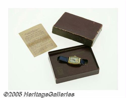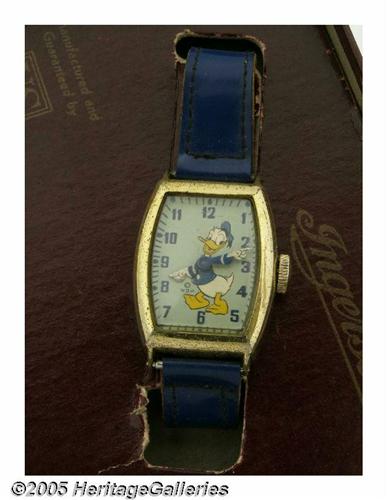 <B>Donald Duck 1947 Rectangular Watch (Ingersoll, 1947).</B></I> A companion to the rare Daisy Duck watch of the same year, many collectors find that, while this watch occasionally surfaces, locating one with a nice original band is a difficult task indeed. The colored plastic coating to the leather band cracks and wears easily with repeated wear. The example offered here has never been worn, and the band shows absolutely no wear! The original instructions are intact as is the original brown box. It should be noted that, because of the lack of color and "personality", Ingersoll non-illustrated boxes are, in the experience of many veteran Disneyana collectors, much more difficult to find. This one shows wear to extremities. With the unused watch, instructions and box, this is one irresistible package! <I>From the Larry Jacobs Collection.</B></I>