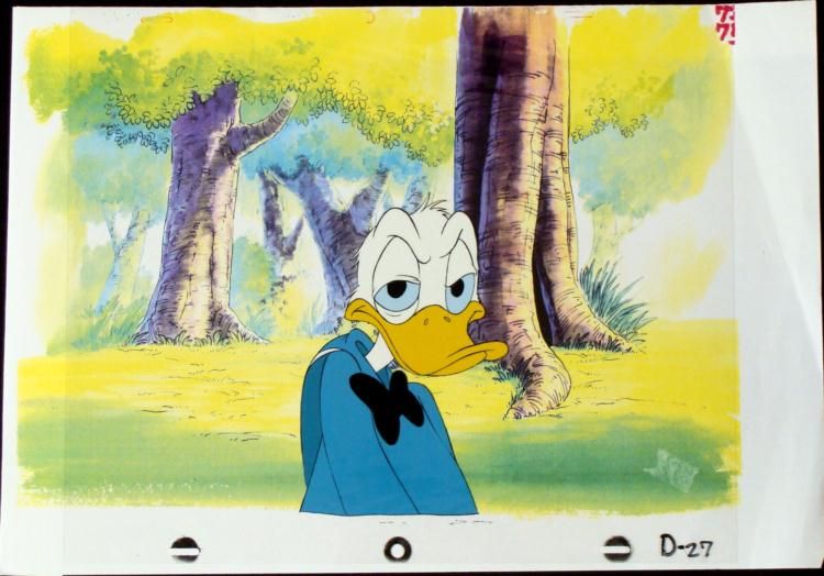 Donald Duck looks annoyed  *  *  * Original Animation Cel & Printed Background *  * Medium: Hand painted acetate celDetails: Animation notations and peg holes *  * Size of background: 10 1/2 x 15 inches  *  * Size of cel: 10 1/2 x 12 1/2 inchesCondition: Very good * This is an original hand-painted cel set-up used in the production of the "Walt Disney Shows." Each one-of-a-kind set-up represents a slight change in position of the characters. When individually photographed and projected in rapid succession, the images appear *  to move. To created production cels, the original animator's drawing is transferred onto an acetate cel (by hand-inking and/or photo copying). The cel is then hand-painted on the reverse side. The background accompanying this cel is a reproduction printed *  background. *