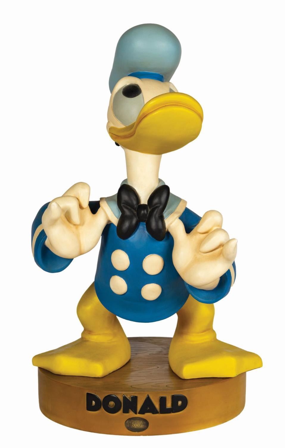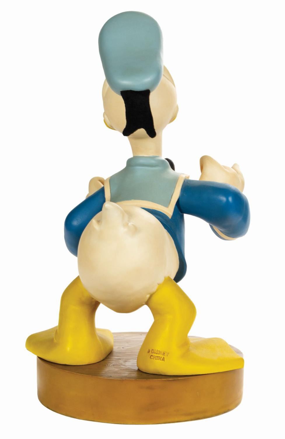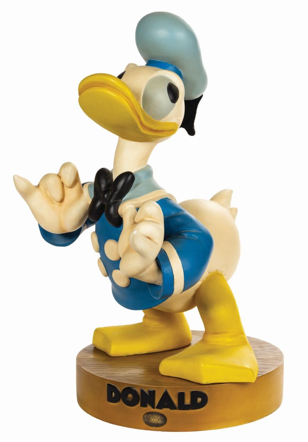 (Disney, 1999) A limited edition Donald Duck "Big Fig" statue. Constructed of cast resin, the strikingly detailed figure teems with personality, and is painted with all the familiar character hallmarks. Donald is accompanied by a circular faux wood cast resin base, molded with his name and the year of his first film appearance, 1934. The bottom is marked with edition information, stating the figure's production run was limited to the year 1999. The figure measures 18.5"x10" and 13" deep, and the base is 2.5" tall x 11.5" in diameter. Both are in fine condition with only minor surface wear.