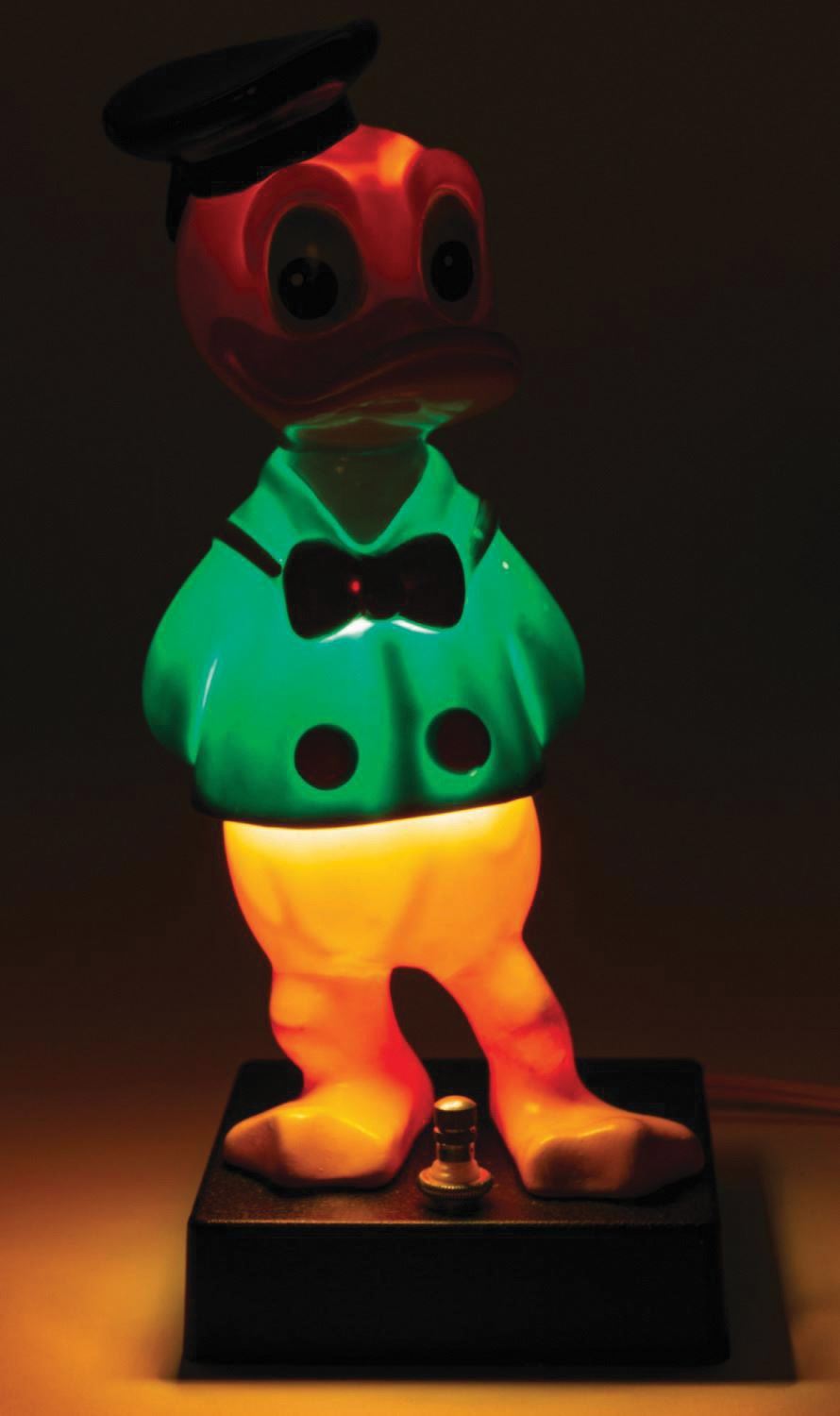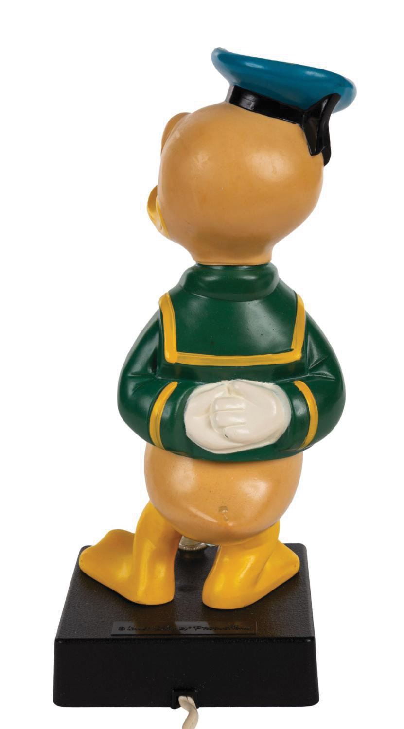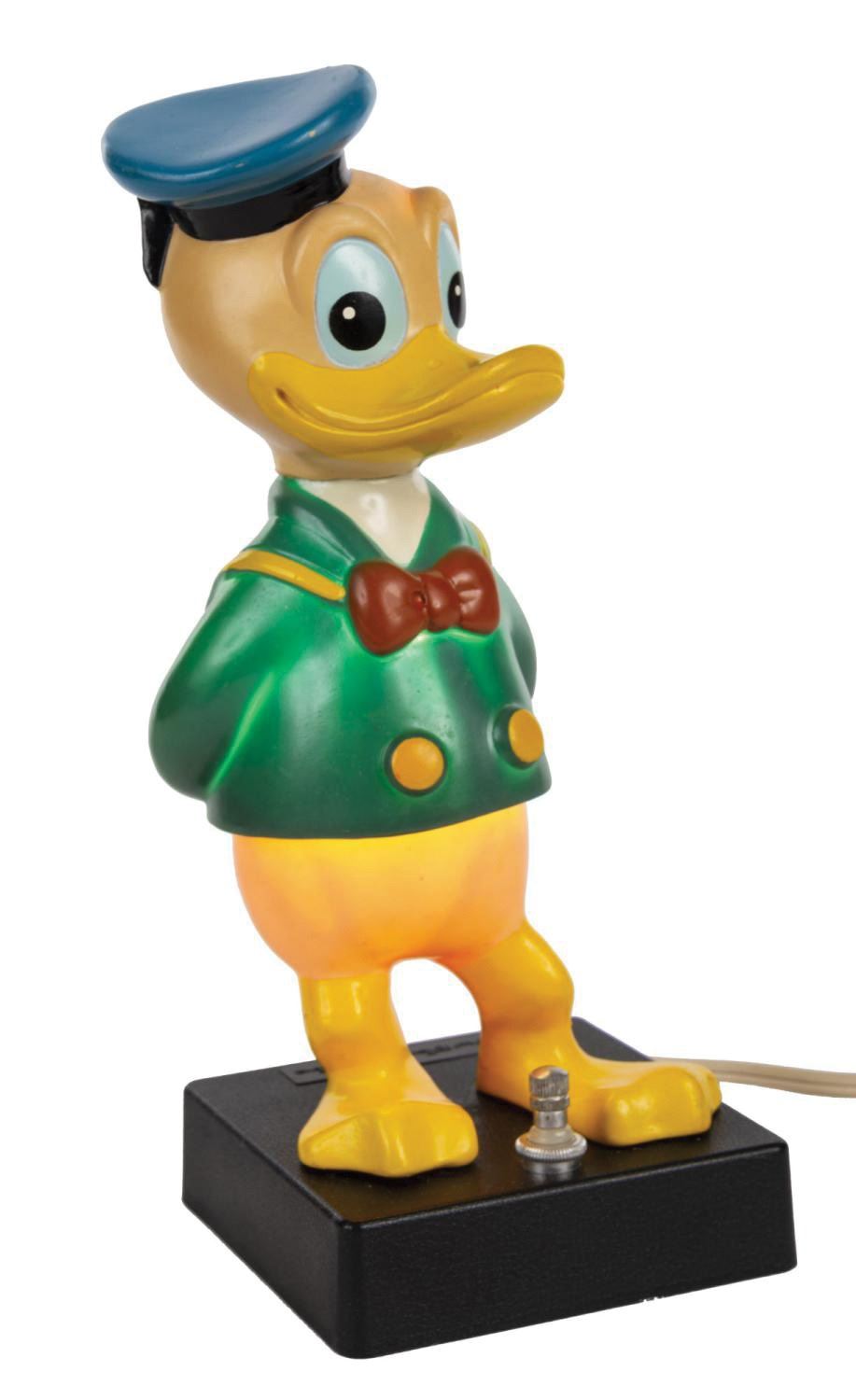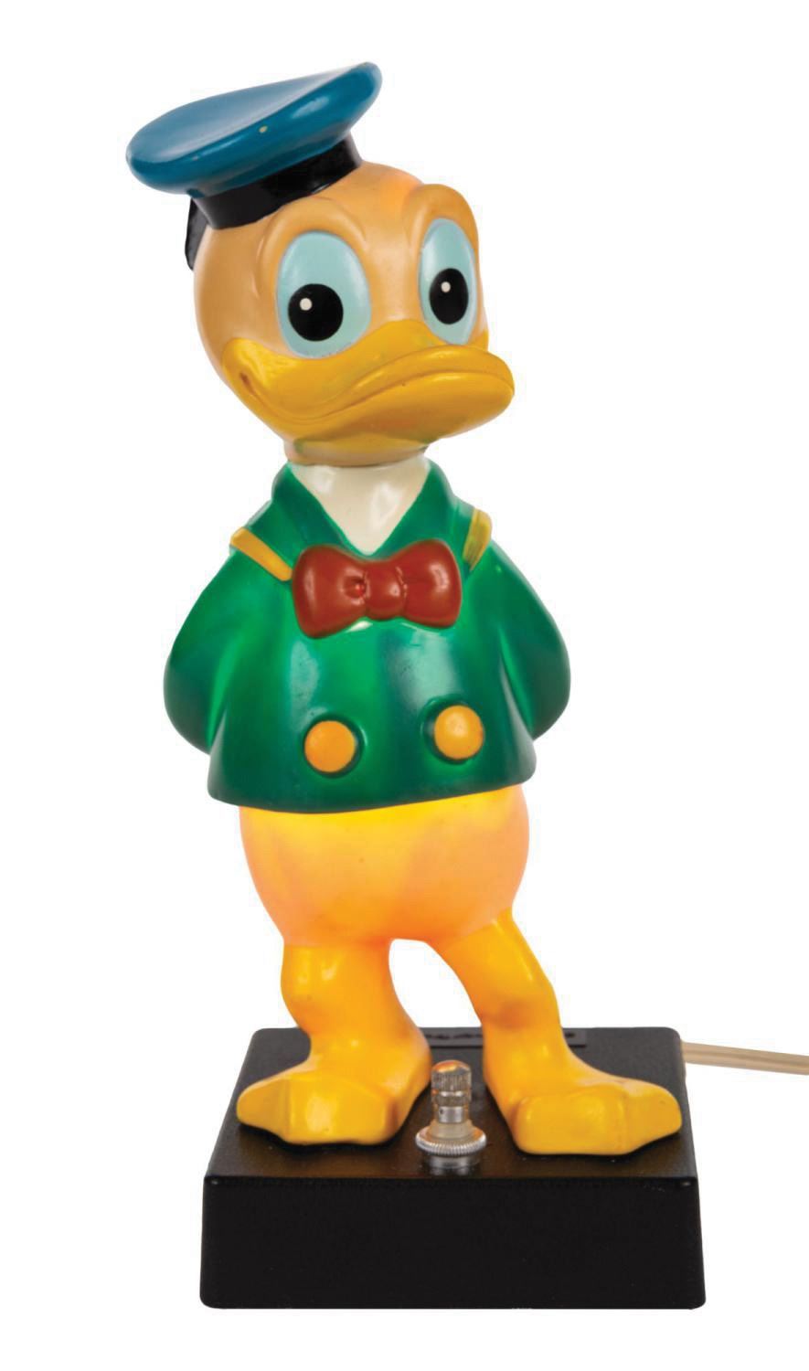 (Disney, 1960s-1970s) A Donald Duck bobble-head lamp by Universal Lamp. The still-functioning lamp provides a charming depiction of this timeless Disney character. Measuring 9.75"x4"x4", the lamp is in very good condition, with little wear and minor discoloration from age.