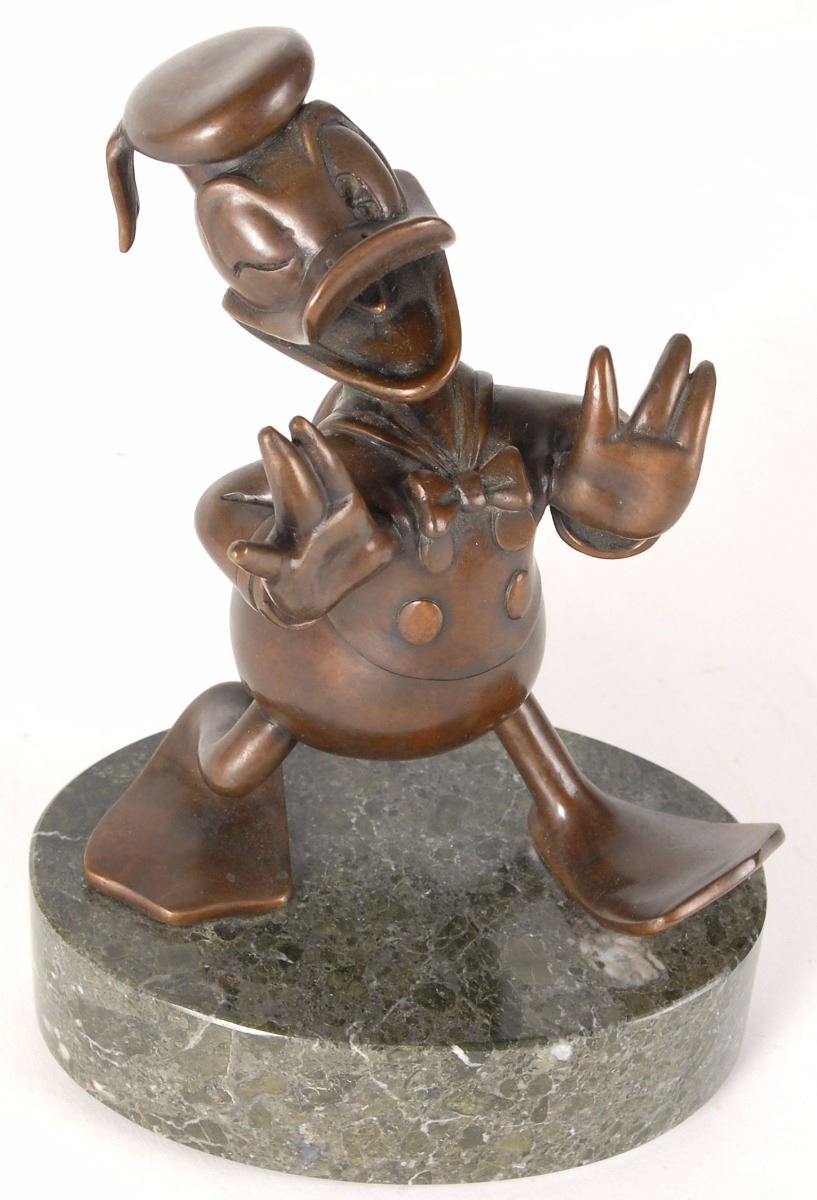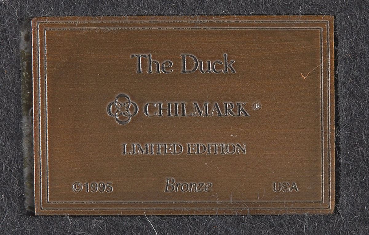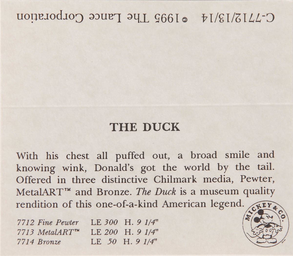 Well-crafted bronze figurine entitled ‘The Duck’ produced by Chilmark, created in a limited edition of 50, set on a green marble base, measuring an overall 9.25? tall, weighing 7.2 pounds. The figurine portrays the classic character broadly smiling with his chest puffed out. In fine condition. Accompanied by the original paperwork.