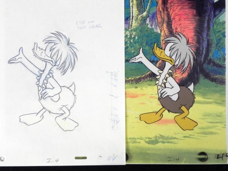 Donald Fauntleroy Duck is a cartoon character created in 1934 at Walt Disney Productions. Donald is an anthropomorphic white duck with a yellow-orange bill, legs, and feet. He typically wears a sailor suit with a cap and a black or red bow tie. Donald * is most famous for his semi-intelligible speech and his mischievous and irritable personality. Along with his friend Mickey Mouse, Donald is one of the most popular Disney characters and was included in TV Guide's list of the 50 greatest cartoon characters * of all time in 2002. (Clears throat) ahhheemm.. To be or not to be, that is... Shoot, how does the rest of that go? <ul type="disc"> * Original Printed Background, Animated Cel, and DrawingOriginal "rough" animation drawing, in non-photo blue and black pencil with the notations in black and non-photo blue. * Overall Size of Background: 11" x 13 1/4" Overall Size of Drawing: 10 1/2" x 12 1/2" Overall Size of the Cel: 10 1/2" x 12 1/2" Excellent condition * This is an original hand-painted cel set-up used in the production of an episode of "Donald Duck." Each one-of-a-kind set-up represents a slight change in position of the characters. When individually photographed and projected in rapid succession, the images * appear to move. To create production cels, the original animator's drawing is transferred onto an acetate cel (by hand-inking and/or photo copying). The cel is then hand-painted on the reverse side. The background accompanying this set-up is a reproduction * background. * * The printed background, drawing and cel are ready to be matted and framed. The notations are located at the bottom and top of the drawing, top of the background, and bottom of the cel.