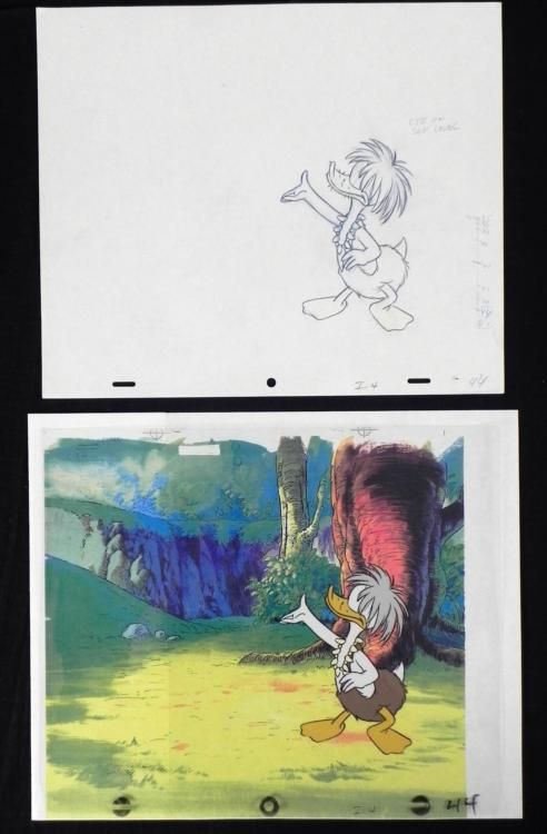 Donald Fauntleroy Duck is a cartoon character created in 1934 at Walt Disney Productions. Donald is an anthropomorphic white duck with a yellow-orange bill, legs, and feet. He typically wears a sailor suit with a cap and a black or red bow tie. Donald * is most famous for his semi-intelligible speech and his mischievous and irritable personality. Along with his friend Mickey Mouse, Donald is one of the most popular Disney characters and was included in TV Guide's list of the 50 greatest cartoon characters * of all time in 2002. (Clears throat) ahhheemm.. To be or not to be, that is... Shoot, how does the rest of that go? <ul type="disc"> * Original Printed Background, Animated Cel, and DrawingOriginal "rough" animation drawing, in non-photo blue and black pencil with the notations in black and non-photo blue. * Overall Size of Background: 11" x 13 1/4" Overall Size of Drawing: 10 1/2" x 12 1/2" Overall Size of the Cel: 10 1/2" x 12 1/2" Excellent condition * This is an original hand-painted cel set-up used in the production of an episode of "Donald Duck." Each one-of-a-kind set-up represents a slight change in position of the characters. When individually photographed and projected in rapid succession, the images * appear to move. To create production cels, the original animator's drawing is transferred onto an acetate cel (by hand-inking and/or photo copying). The cel is then hand-painted on the reverse side. The background accompanying this set-up is a reproduction * background. * * The printed background, drawing and cel are ready to be matted and framed. The notations are located at the bottom and top of the drawing, top of the background, and bottom of the cel.