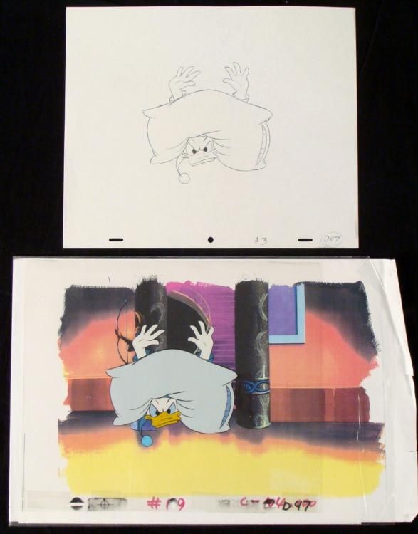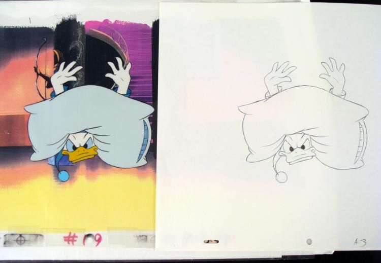 Donald Duck is a cartoon character created in 1934 at Walt Disney Productions. Donald is an anthropomorphic white duck with a yellow-orange bill, legs, and feet. He typically wears a sailor suit with a cap and a black or red bow tie. Donald is most famous * for his semi-intelligible speech and his mischievous and irritable personality. Along with his friend Mickey Mouse, Donald is one of the most popular Disney characters and was included in TV Guide's list of the 50 greatest cartoon characters of all time in * 2002 * * * * Will somebody please TURN DOWN THE NOISE!! I'M TRYING TO SLEEP HERE!!! * * * * The background that accompanies this cel doesn't correspond to the episode the cel is from. However, the cel does come with a matching drawing overlay. * * * Original Drawing, Printed Background, and Animated Cel * Overall Size of Background: 11" x 17" * * Overall Size of the Cel: 10 1/2" x 12 1/2" * Original "rough" animation drawing, in black and non-photo blue pencil, with the notations in black and non-photo blue. * Overall Size of Drawing: 10 1/2" x 12 1/2" Overall Condition: Cel and Drawing- Excellent and Background- Very Good * * * * This is an original hand-painted cel set-up used in the production of an episode of "Donald Duck." Each one-of-a-kind set-up represents a slight change in position of the characters. When individually photographed and projected in rapid succession, the images * appear to move. * * To create production cels, the original animator's drawing is transferred onto an acetate cel (by hand-inking and/or photo copying). The cel is then hand-painted on the reverse side. The background accompanying this set-up is a reproduction background. * * * The background, drawing, and cel are ready to be matted and framed. The animators notations are located at the bottom of all of them. The right side of the background has been creased with some small rips along the side. *
