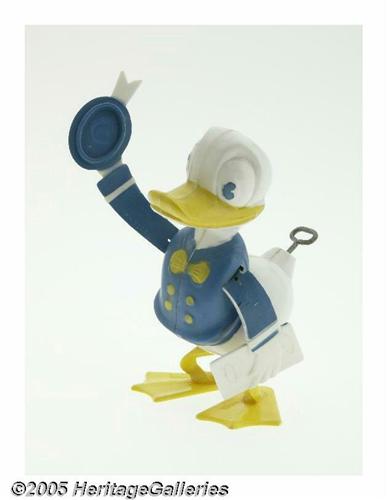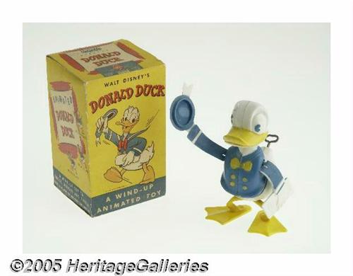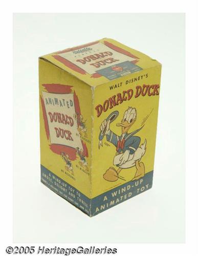 <B>Donald Duck Celluloid Wind-Up Toy with Box (Reliable Plastics Co., undated).</B></I> A Donald Duck wind-up toy. This celluloid Donald Duck toy has unique movements designed to delight young and old. Packaged in colorful box featuring Donald Duck in same pose as toy. Box measures 4" x 4" x 6.5". The complete box exhibits some shelf and edge wear. Toy measures 6" high. Some very slight paint chipping, otherwise in Excellent condition. <I>From the Larry Jacobs Collection.</B></I>