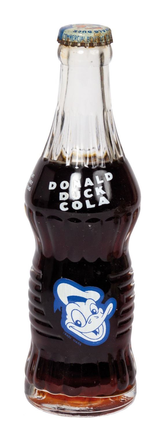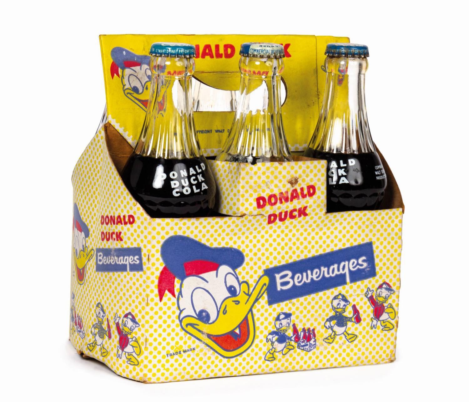 (Commercial Beverage Co., c.1940s) A vintage six pack of Donald Duck Cola, including (6) sealed bottles of soda and a paper six pack holder. This signature soda was manufactured from 1940 until 1950. Measuring 8"x7.25" and 5" deep, the six pack is in very good condition. The holder exhibits some minor fading, rubbing, spot soiling, and shelf wear. The bottles, each approximately 8.25" tall, show some wear, fading, and oxidation to the caps, and one has chipping to the Donald Duck graphic.