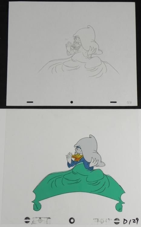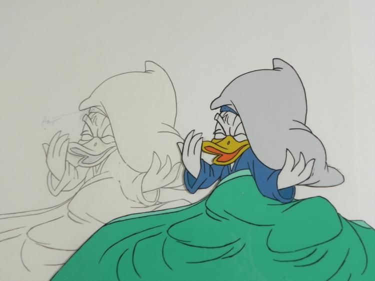 Donald Fauntleroy Duck is a cartoon character created in 1934 at Walt * Disney Productions. Donald is an anthropomorphic white duck with a * yellow-orange bill, legs, and feet. He typically wears a sailor suit * with a cap and a black or red bow tie. Donald * is most famous for his semi-intelligible speech and his mischievous and * irritable personality. Along with his friend Mickey Mouse, Donald is * one of the most popular Disney characters and was included in TV Guide's * list of the 50 greatest cartoon characters * of all time in 2002. * * Would you cut that RACKET OUT!!!!! * Original Animation Cel and * DrawingOriginal "rough" drawing in black and * non-photo blue pencil with the notations in non-photo * blueOverall size is a 12-field drawing that is 10 * 1/2" x 12 1/2"Size of cel: 10 1/2" x 12 * 1/2"Overall condition: * Cel- Excellent and Drawing- Very good; spot of surface wear to the paper * This is * an original hand-painted cel used in * the production of an episode of "Donald Duck." Each cel represents a * slight change in position of the characters. When individually * photographed and projected in rapid succession, the images * appear to move. To * create production cels, the original animator's drawing is transferred * onto an acetate cel (by hand-inking and/or photo copying). The cel is * then hand-painted on the reverse side. * * * The cel and drawing received by the winning bidder may be ever * so slightly different than that in the auction photo. * * The drawing and cel are ready to be matted and * framed. The notations are located at the bottom of * both.