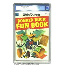 Donald Duck Fun Book File Copy (Dell Giant) #1 (Dell, 1953) CGC VF/NM 9.0 Off-white pages. This bright beauty looks like a file copy. Oh, it is! A small, light corner crease, a tiny bindery blunt at the top of the spine, and one stress mark along the otherwise super-solid squarebound spine keeps this from meeting and exceeding Near Mint status. The latest CGC census ranks this copy just shy of the nicest to be graded. Overstreet 2003 VF/NM 9.0 value = $672; NM 9.4 value = $960. Important notice: Heritage usually auctions material at the rate of 200-250 lots per hour. On some occasions eBay Live bid software or the Internet may not be able to keep up with the pace of the auction. We recommend placing a realistic absentee bid now as insurance to avoid disappointment. Occasionally the auctioneer may eliminate or reject an eBay Live bid, and the auctioneer may also reopen a lot after the close of the eBay live bidding (usually because we missed an audience bid), and may reject your bid even if it shows you as the winning bidder. By bidding via eBay Live, you agree that Heritage may award the lot to another bidder at its sole discretion under the circumstances described above or any other reasonable circumstances. Since eBay bids are not shown to us until we open the lot on the floor, we treat those bids just like floor bids. In most cases the floor responds before the eBay bid is presented to us, due to Internet lag time, so for consistency we have made it a policy that floor bids are always considered first over tie eBay live bids. Also please note that all Heritage lots purchased through eBay Live carry a 20% Buyer's Premium. Please make sure you read the Terms and Conditions before you bid.