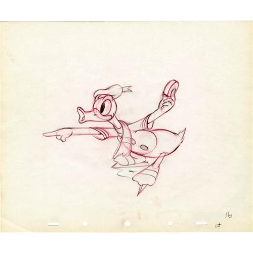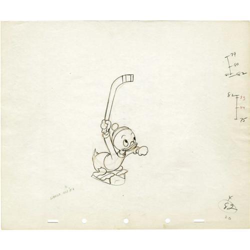 <B>Donald Duck "Hockey Champ" Animation Production Drawing Original Art (Disney, 1939).</B></I> Donald Duck plays hockey with one of his nephews in this set of drawings (OPD’s #16 and 82). Each drawing was rendered in graphite on a 12 field sheet of animation paper. There is some paper tanning; otherwise the drawings are in Very Good condition.<BR><BR><b>Shipping:</b> Flat Material, Small (<a target="_blank" href="http://www.heritageauctions.com/common/shipping.php">view shipping information</a>)