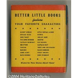 <B>Donald Duck Off the Beam Better Little Book #1438 (Whitman, 1943) Condition: VF/NM.</B></I> Donald is in trouble again on this very colorful cover. This book is a second printing from the World War II era with a few less pages than the original version, and seems to have a thinner cover than most BLBs. As a result, this one is tough to find in high grade; this copy looks really great, but there is a slight dent in the upper top cover that can be seen when the book is held at an angle. It's a small defect, and certainly doesn't detract from the overall eye-appeal of this 352-page beauty. Al Taliaferro art is featured, and there is a flip-movie added to the upper corners. Overstreet 2004 VF/NM 9.0 value = $150. <BR><BR><B>Important notice:</B> Heritage usually auctions material at the rate of 200-250 lots per hour. On some occasions eBay Live bid software or the Internet may not be able to keep up with the pace of the auction. We recommend placing a realistic absentee bid now as insurance to avoid disappointment. Occasionally the auctioneer may eliminate or reject an eBay Live bid, and the auctioneer may also reopen a lot after the close of the eBay live bidding (usually because we missed an audience bid), and may reject your bid even if it shows you as the winning bidder. By bidding via eBay Live, you agree that Heritage may award the lot to another bidder at its sole discretion under the circumstances described above or any other reasonable circumstances. Since eBay bids are not shown to us until we open the lot on the floor, we treat those bids just like floor bids. In most cases the floor responds before the eBay bid is presented to us, due to Internet lag time, so for consistency we have made it a policy that floor bids are always considered first over tie eBay live bids. Also please note that all Heritage lots purchased through eBay Live carry a 20% Buyer's Premium. Please make sure you read the Terms and Conditions before you bid.