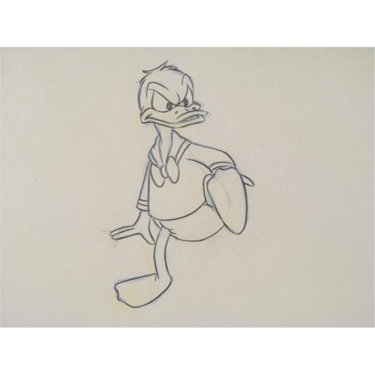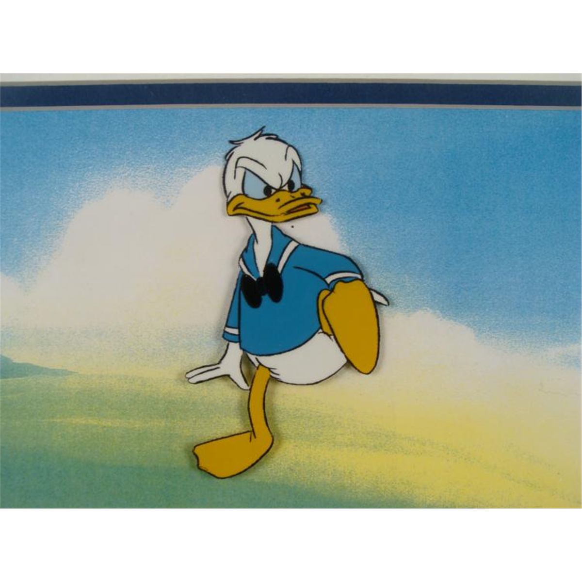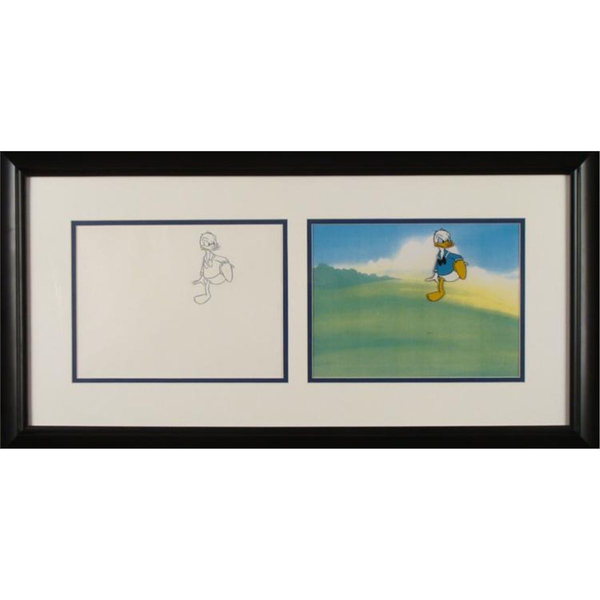 This is an original Donald Duck animation production cel and drawing. It was used in a 1982 Epcot Center film titled "Careers." The cel is hand painted on a printed background. The drawing is black and non-photo blue pencil on paper. Together the drawing and cel are nicely framed side by side to show the way the scene developed in the animation process. This cel is also an original piece of Epcot history. * Image size of each: 7 1/2 x 10 1/2 inchesFraming: Double matted in black and white, in matte black laminate wood frameFrame size: 15 1/4 x 30 inchesCertificate of Authenticity: From Choice Collectibles ASG, Inc.Condition: Excellent
