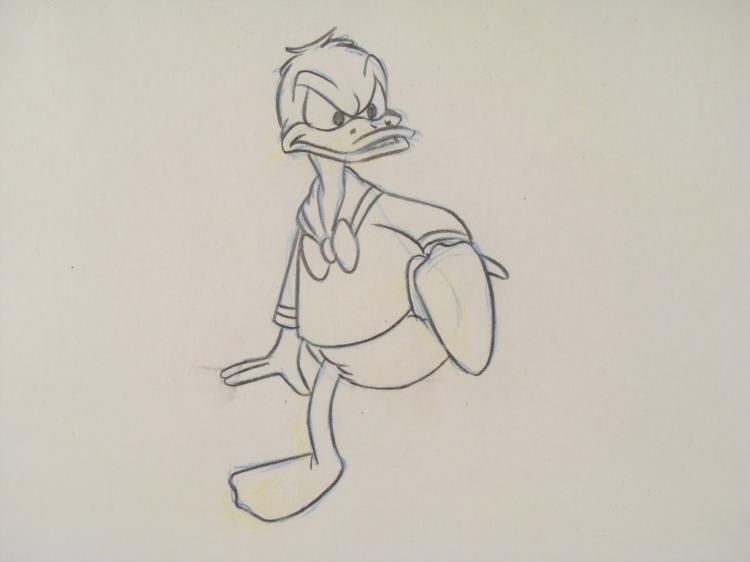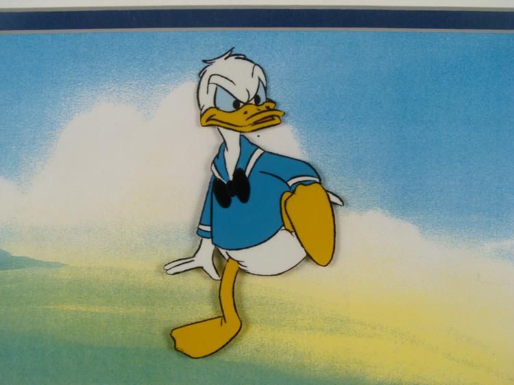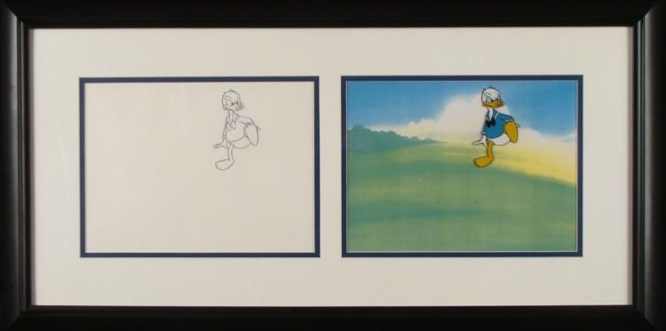 This is an original Donald Duck animation production cel and drawing. It was used in a 1982 Epcot Center film titled "Careers." The cel is hand painted on a printed background. The drawing is black and non-photo blue pencil on paper. Together the drawing and cel are nicely framed side by side to show the way the scene developed in the animation process. This cel is also an original piece of Epcot history. * Image size of each: 7 1/2 x 10 1/2 inchesFraming: Double matted in black and white, in matte black laminate wood frameFrame size: 15 1/4 x 30 inchesCertificate of Authenticity: From Choice Collectibles ASG, Inc.Condition: Excellent