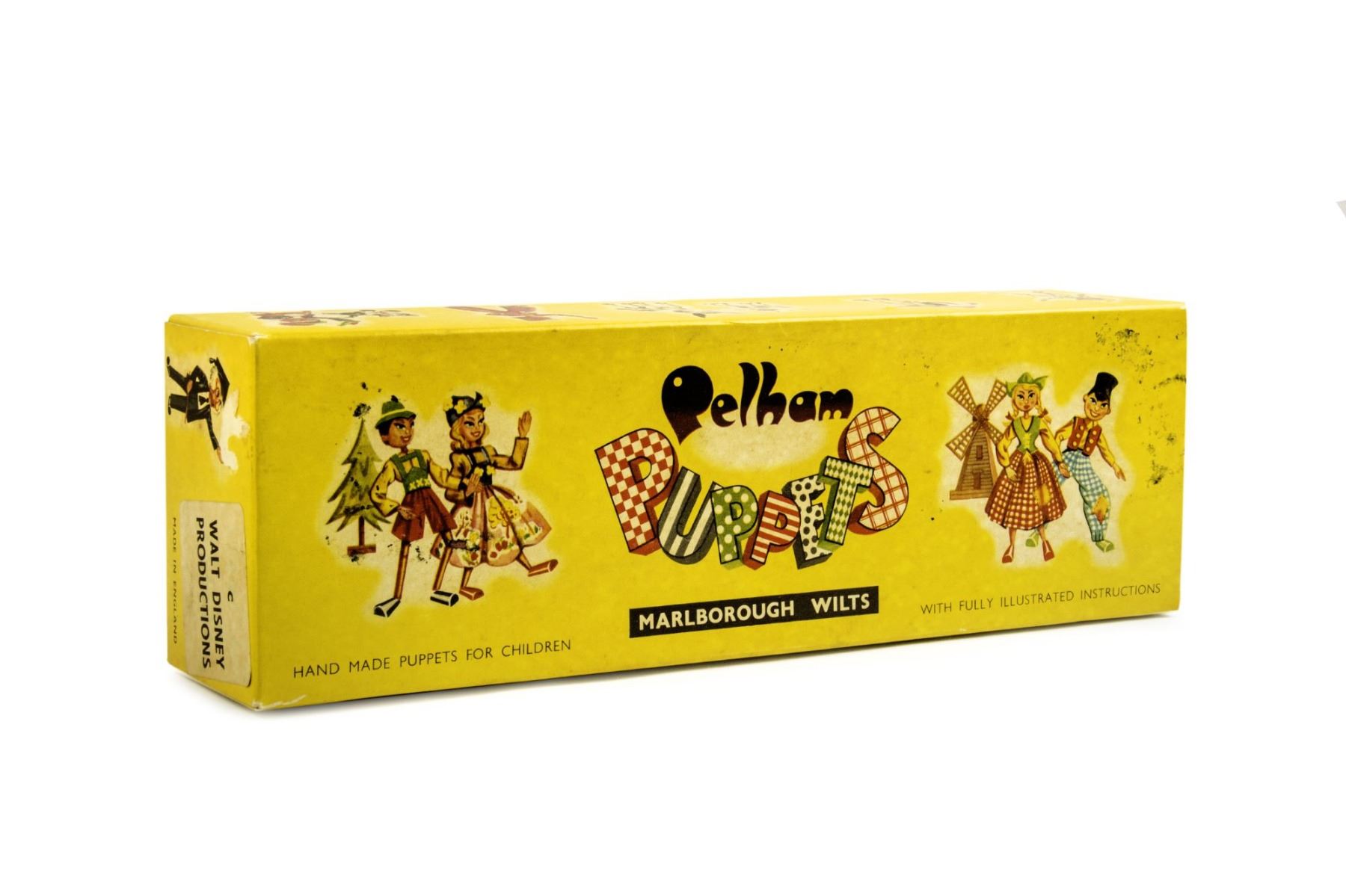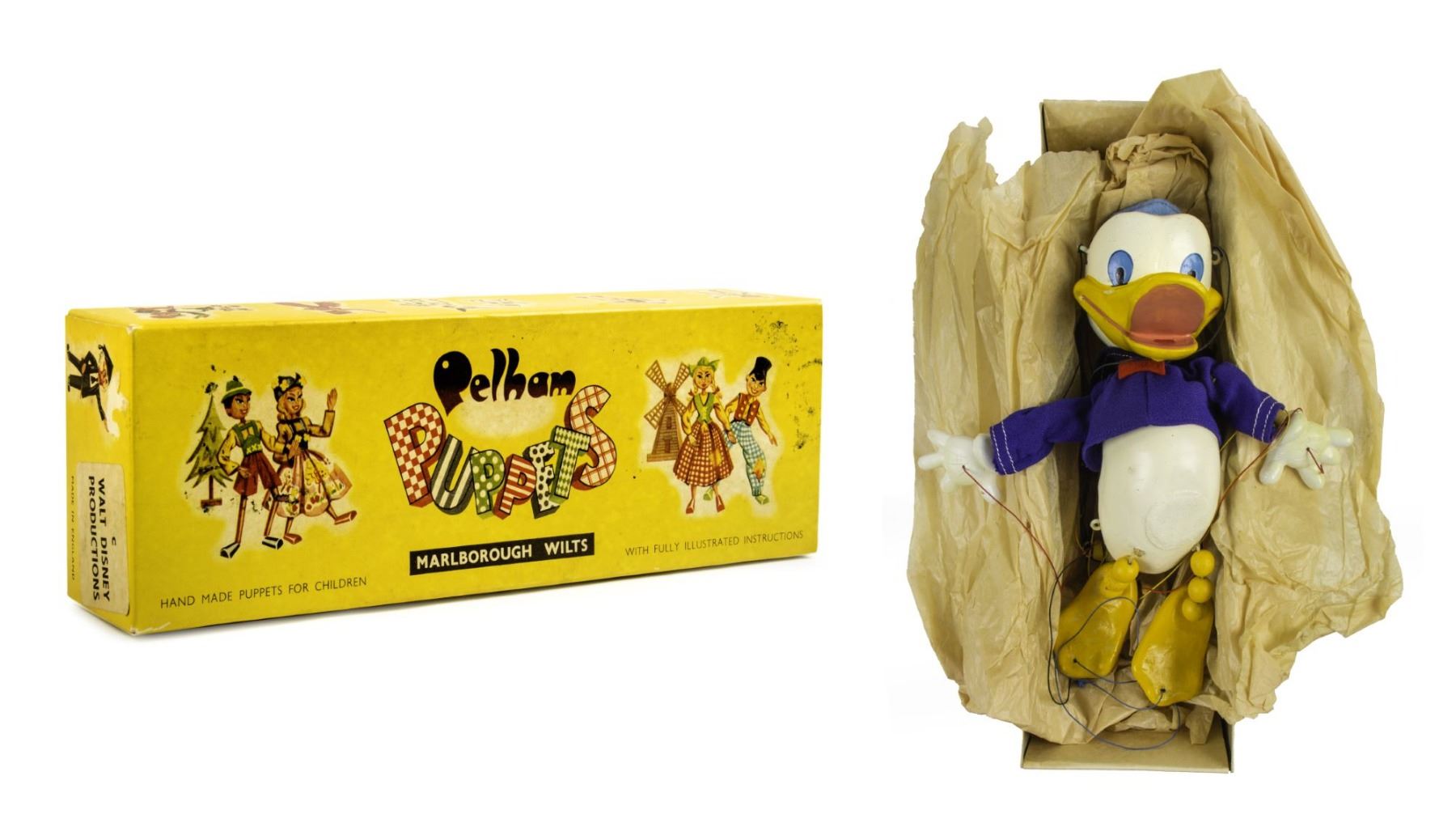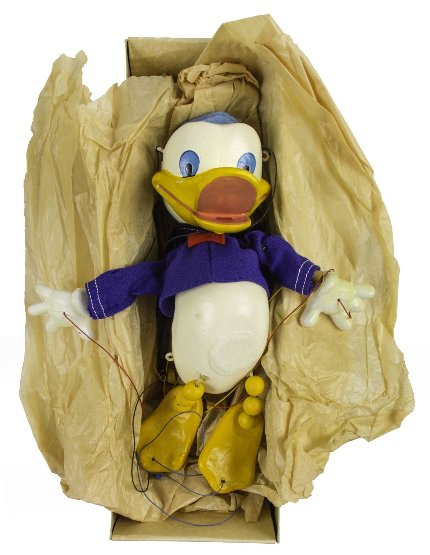 (Pelham Puppets, c.1950s-60s) A rare Donald Duck Pelham Puppet, believed to be a slightly older model of the mid-1960's Donald puppet. This puppet comes in its original Pelham box and measures 13". The condition is very good with minor wear.