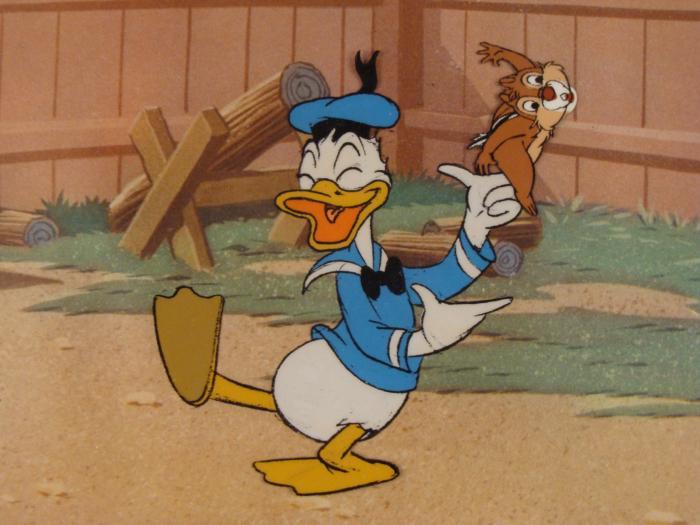 This cel features not only the star character Donald Duck, but also Dale the chipmunk of "Chip and Dale," and the Brazillian parrot Jose Carioca. Jose only appeared in a few films, and we're not certain which one this cel is from. The background is a copy printed on paper.