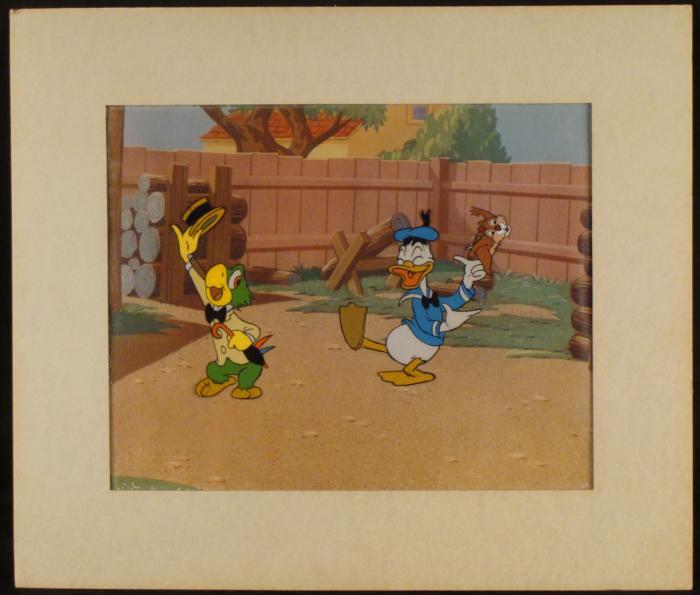 This cel features not only the star character Donald Duck, but also Dale the chipmunk of "Chip and Dale," and the Brazillian parrot Jose Carioca. Jose only appeared in a few films, and we're not certain which one this cel is from. The background is a copy printed on paper.