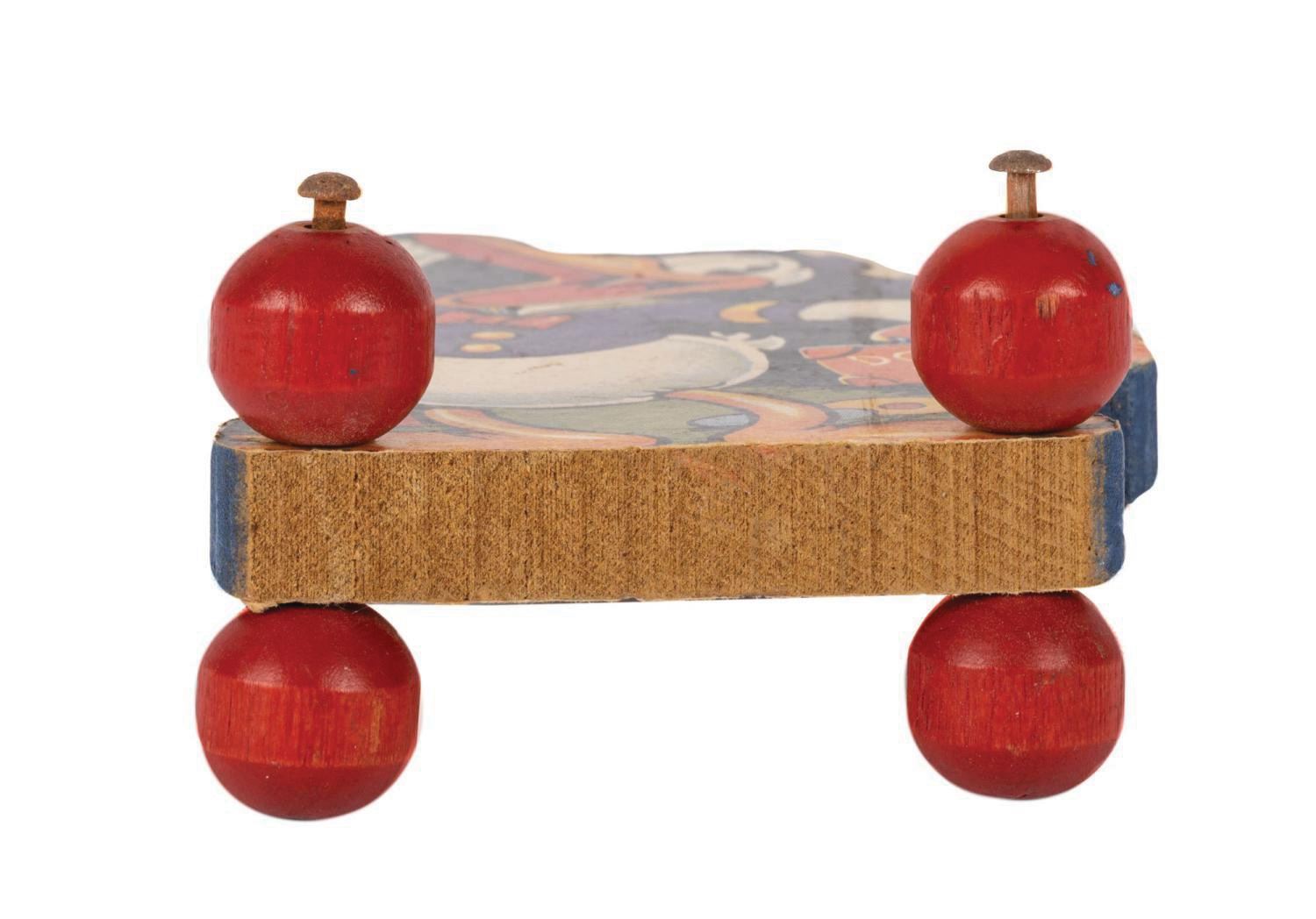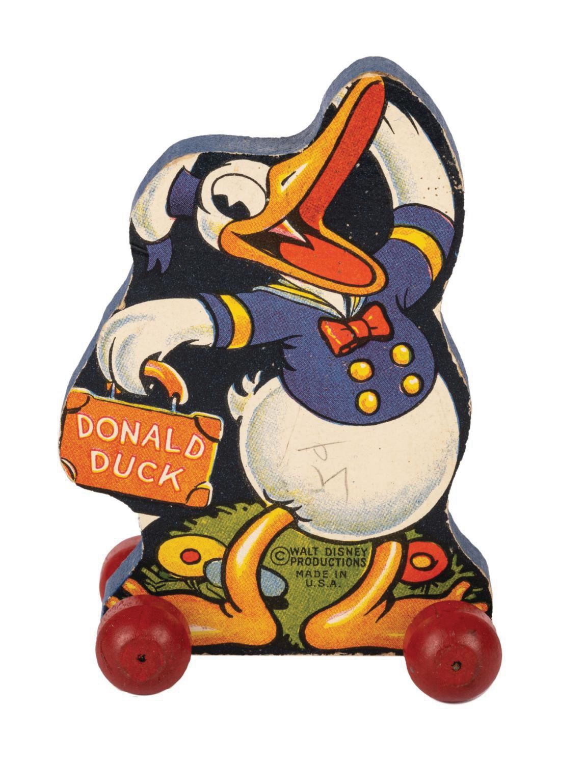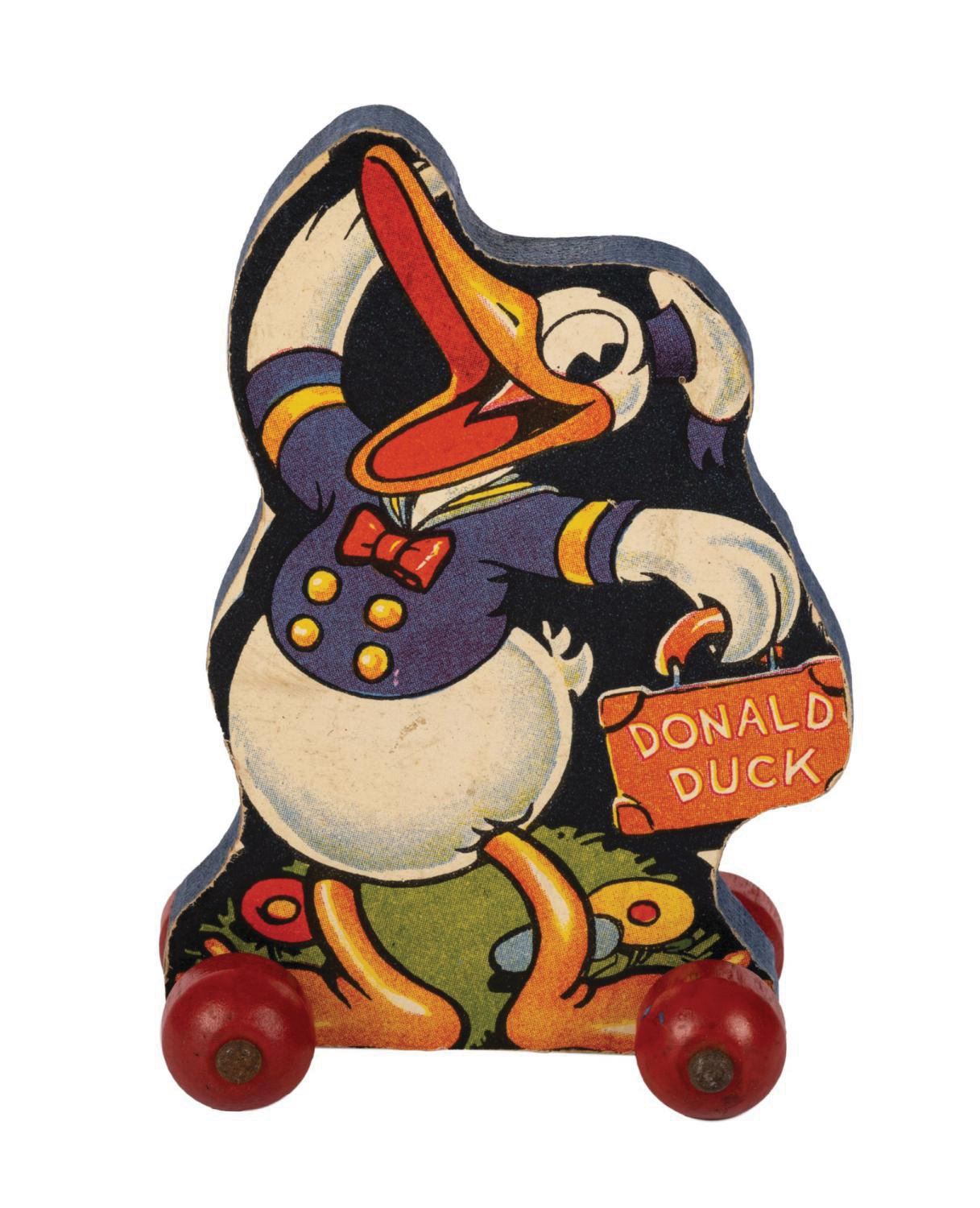(Fisher-Price, 1936) A rare Donald Duck rolling motion toy by Fisher-Price. The wooden toy with printed paper laminated sides was created in a series of Disney character wooden toys featuring other contemporary characters including Mickey, Pluto, and Elmer. Measuring 4.25" tall, the toy is in very good condition for its age, exhibiting mild toning and surface wear.