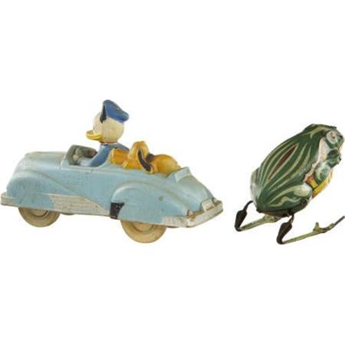 <B>Donald Duck Rubber Car</B></I>, made by Siberling Rubber Co. Much of the paint still remains. Included in this lot is a tin made in Japan wind-up frog. The frog shows wear.<BR><BR><b>Shipping:</b> Miscellaneous Collectibles, Larg (<a target="_blank" href="http://www.heritageauctions.com/common/shipping.php">view shipping information</a>)