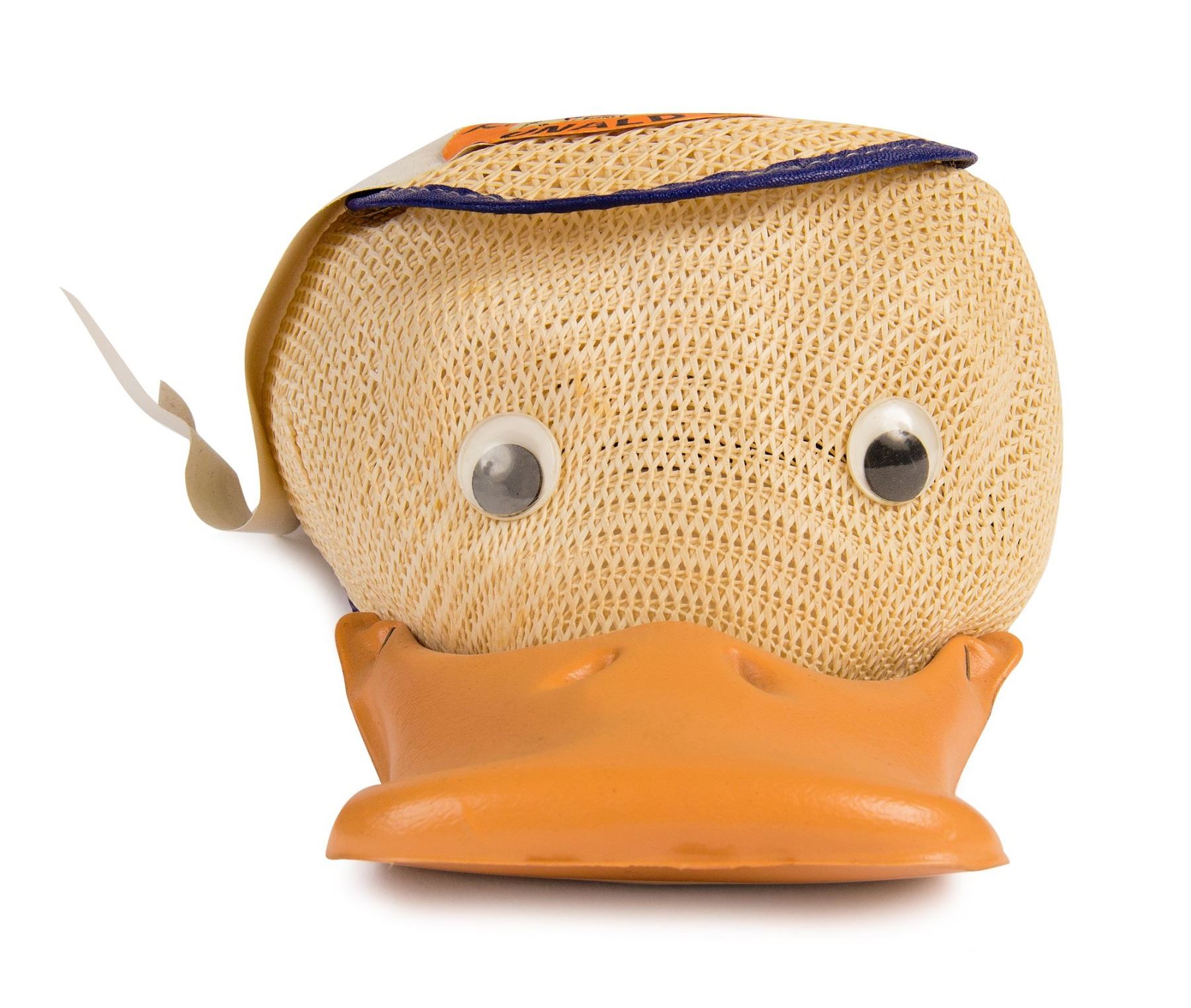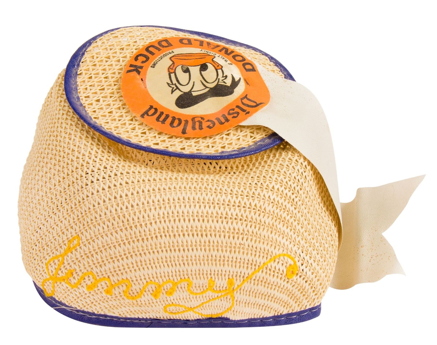 (Disneyland, c.1950s-60s) An early Donald Duck child's hat with working squeaker in its bill. The original Disneyland ribbon is still adhered to the top. This popular early park souvenir is marked as a child's small inside and is in very good condition with minor wear.