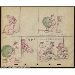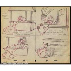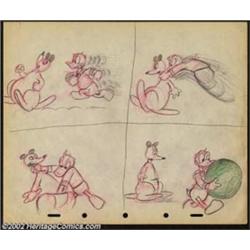 Donald Duck Storyboards #1 (RKO, 1942). Donald Duck goes to battle with a clever Kangaroo in this storyboard sequence consisting of 11 pages. Each page features four panels of penciled art and is on animators "peg" paper. It is unknown if this sequence was ever taken beyond this early conceptual stage, but it certainly shows Donald at his irascible worst, wielding a meat cleaver in anger! This storyboard was obtained from the late Disney animator Tex Henson. Very Fine. Important notice: We expect to be auctioning lots at the rate of 200-250 per hour. Sometimes eBay Premier live bid software cannot keep up with that pace, so we strongly recommend that you place a realistic proxy bid now as insurance to avoid disappointment. Also please note that all Heritage/CAA lots purchased through eBay Premier carry a 20% Buyer's Premium. Please make sure you read the Terms and Conditions.