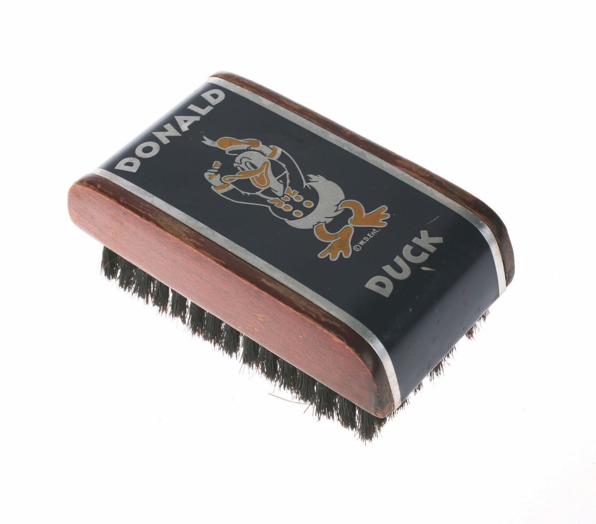 (Henry L Hughes Co., 1930s) This wooden clothes brush from Henry L Hughes Co. features a regal Donald Duck on the metal blue and silver surface. Measures 3.5"x2"x1.5". In very good used condition with minimal wear.