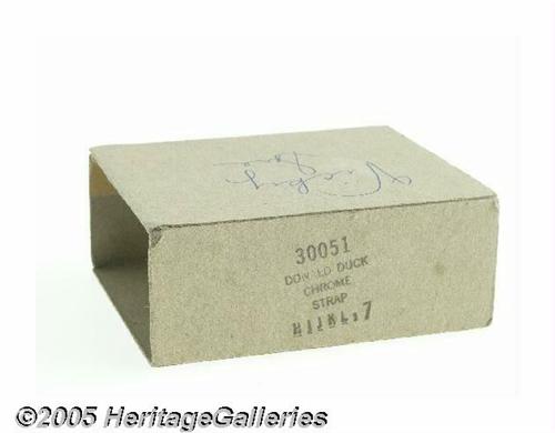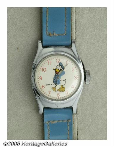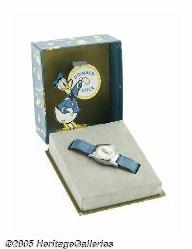<B>Donald Duck Wrist Watch with Pop-Up Box (Ingersoll, circa 1950).</B></I> One of the most challenging areas of Disneyana collecting remains the realm of wrist watches. While even many non-Disney collectors can readily identify some of the early ones, Ingersoll/U.S. Time/Timex produced a large number of character watch variations of the decades. This intriguing Donald Duck watch from U.S. Time dates from around 1950. While the unused Donald Duck watch would usually be the eye catcher, this one is housed in its original box - which features a nifty pop-up picture of Donald when the box is opened. Additionally, the box lid and edges include color pictures of Donald, Daisy and all three Nephews -- Huey, Dewey and Louie. The delicate pop-up picture of Donald has been carefully reattached by a single strip of tap on the bottom outside of the box. As a bonus, the original cardboard sleeve in which the box was packaged is also present. Unknown to many veteran Donald Duck and Disney watch collectors, you may not find another! <I>From the Larry Jacobs Collection.</B></I>