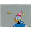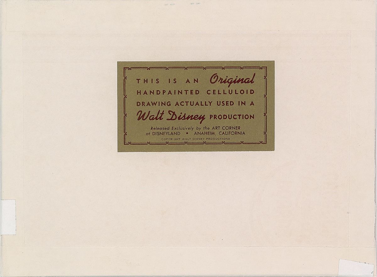 (Walt Disney Studios, 1957) Original production cels featuring Donald Duck and a bird from the ‘Happy Birthday Donald Duck’ cartoon on the Disneyland TV show, showing the lovable duck wearing a party hat. The cels are trimmed to 10 x 7.5 and stapled to their original backing, bearing a gold label on the reverse from the Art Corner at Disneyland. Character images measure 7 x 5 and 1.25 x .75. In fine condition.