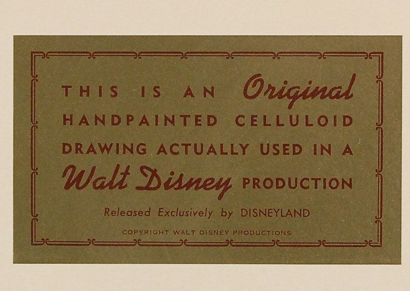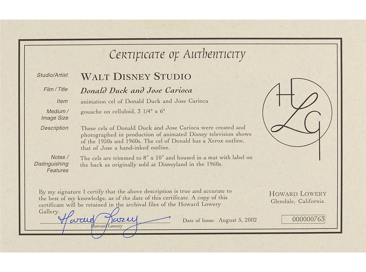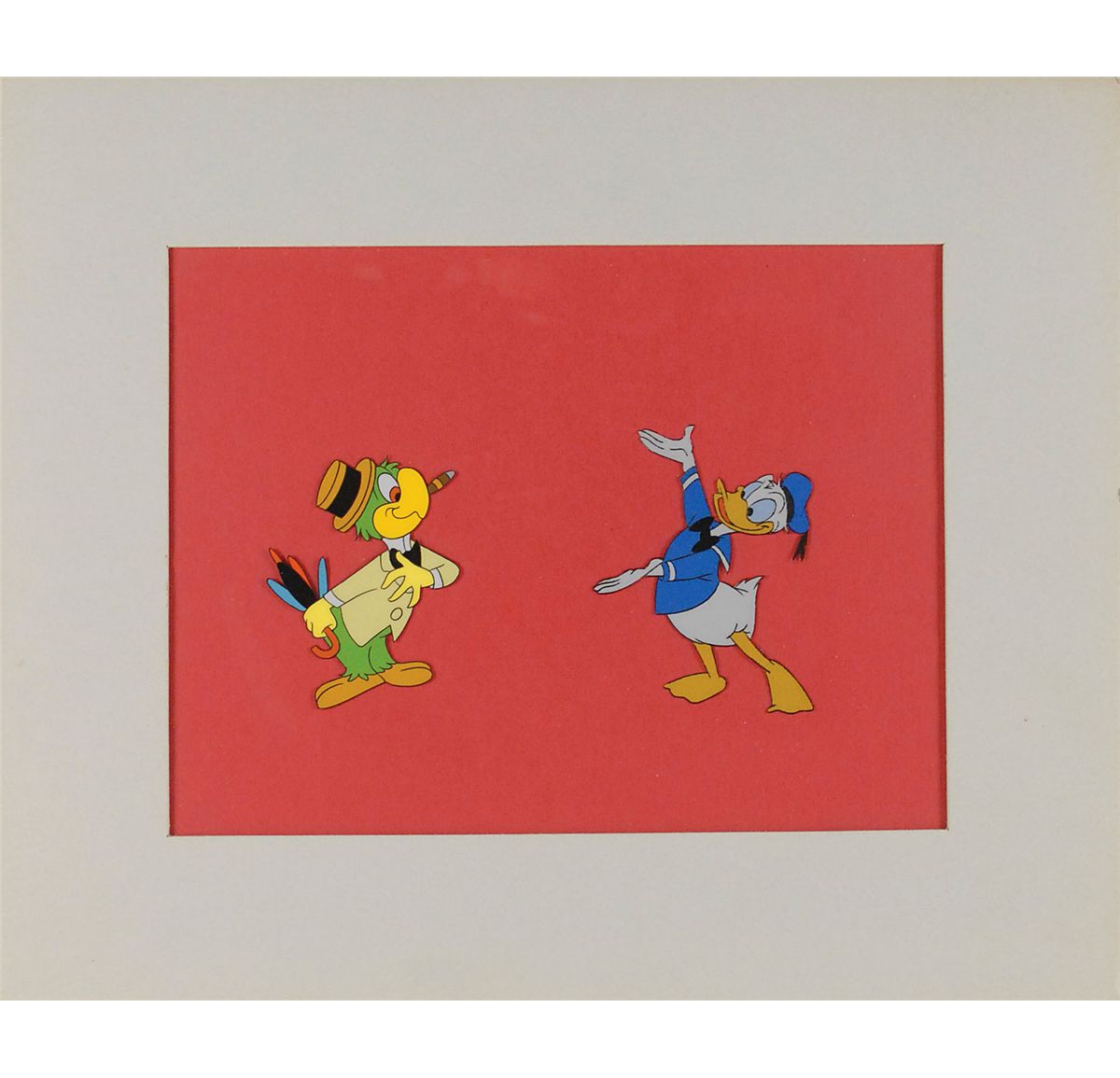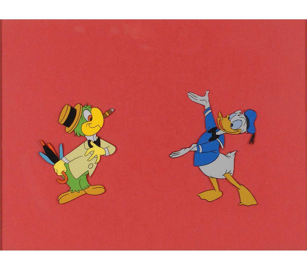 (Walt Disney Studios, 1962) Original production cel featuring Donald Duck and Joe Carioca from a Disney TV show. Image measures 5.75 x 3, with a mat opening of 8.25 x 6.25. Mat dimensions are 12 x 10. In fine condition. Accompanied by a certificate of authenticity from Howard Lowery.