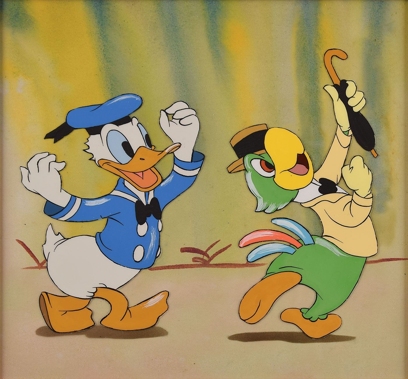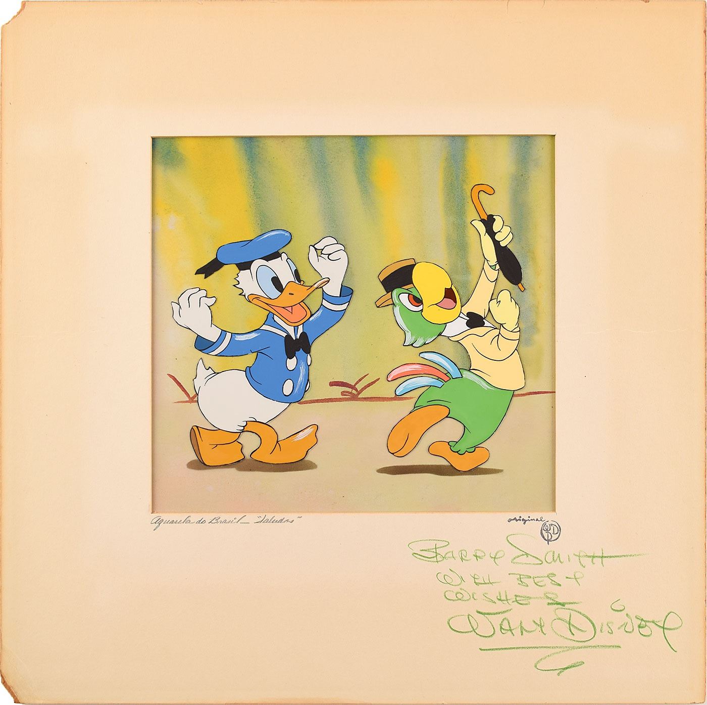 (Walt Disney Studios, 1942) Original production cel featuring Donald Duck and José Carioca from Saludos Amigos, showing the two friends dancing the samba during the 'Aquarela do Brasil' segment of the film, signed and inscribed on the mat in green crayon, "Berry Smith, With best wishes, Walt Disney." The cel has been trimmed and applied to an airbrushed background as prepared by Courvoisier Galleries for sale. Images measure 3.25 x 4.25 (Donald Duck) and 3 x 5.25 (José Carioca), with a mat opening of 7.25 x 7. Matted to an overall size of 13 x 13. In fine condition, with chips to two corners of the mat.
