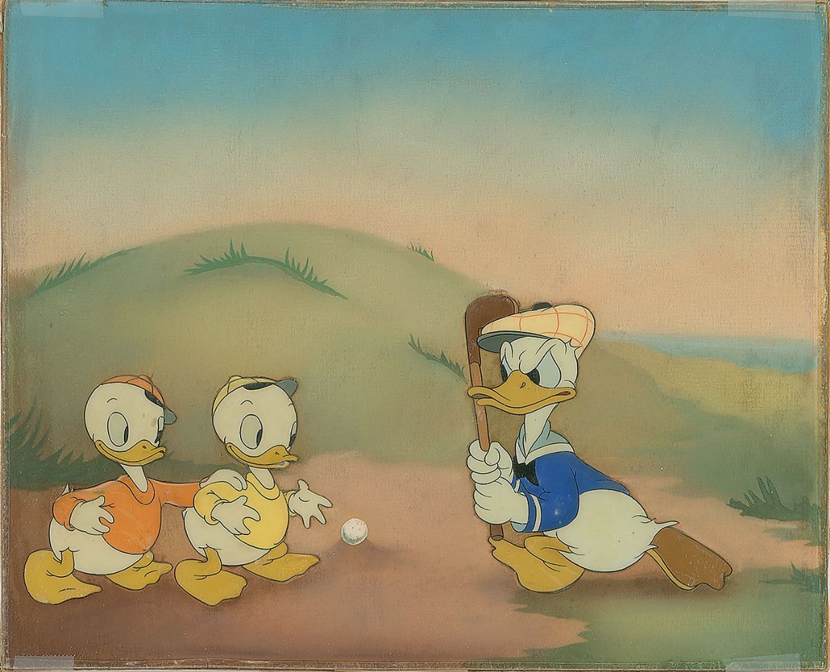 (Walt Disney Studios, 1938) Original production cel featuring Donald Duck and two of his nephews from Donald’s Golf Game, showing Donald with his club raised in anger. The cel has been trimmed and applied to a hand-painted background as prepared by Courvoisier Galleries for sale. Donald image measures 4 x 3.75 and nephews measure 4 x 3, with overall dimensions of 10.75 x 8.75. In fine condition. An extremely attractive, appealing piece.