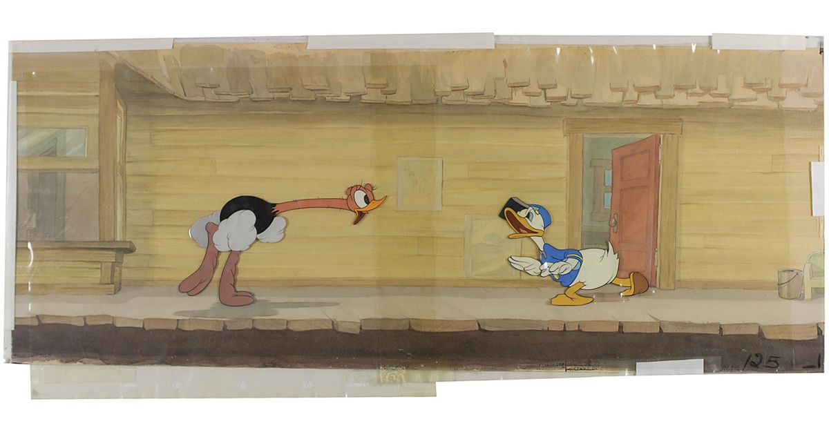 (Walt Disney Studios, 1937) Original production cels on pan production background featuring Donald Duck and Ostrich from Donald’s Ostrich, showing the fowl foes fighting. The cel is placed on a hand-painted pan production background from the same film. Character images measure 6.25 x 3.75 and 4.5 x 3.5, with overall dimensions of 24 x 10. In fine condition. Donald’s Ostrich was produced by Disney in Technicolor as the third cartoon in the Donald Duck series, and released to theaters on December 10, 1937, by RKO Radio Pictures. This short was the only appearance of Hortense the Ostrich in animation, but she appeared in comic books as Donald’s pet beginning with the Donald Duck Annual in 1938.