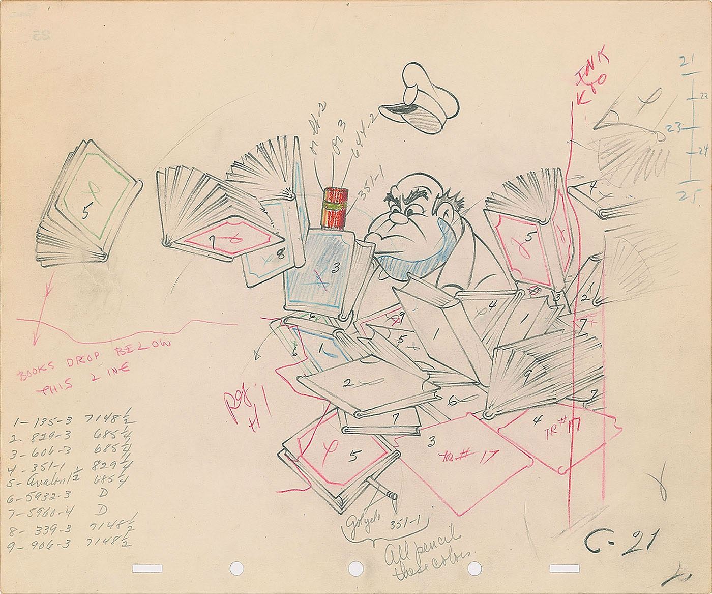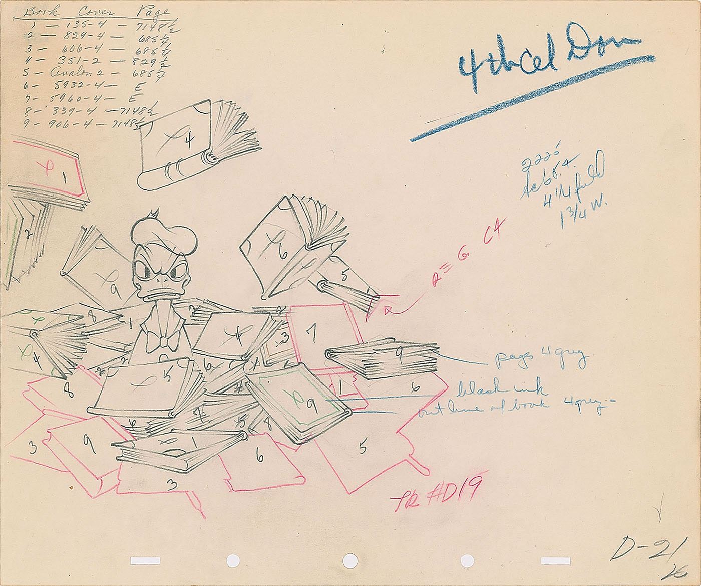 (Walt Disney Studios, 1939) Original production drawings of Donald Duck and the Security Guard from The Autograph Hound, both of which portray the characters frustrated and surrounded by falling books. Both are accomplished in graphite and colored pencil on untrimmed 12 x 10 sheets of animation paper, with the Donald sheet marked "D-21" and the guard sheet identified as "C-21." Images measure 7.5 x 6.75 (Donald with books) and 10.5 x 7.75 (Guard with books). In overall fine condition.
