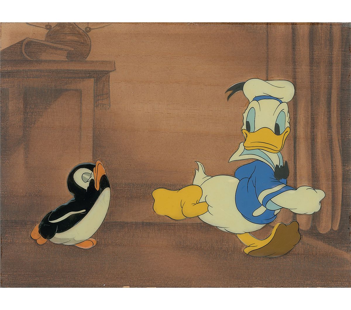 (Walt Disney Studios, 1938) Original production cel set-up featuring Donald Duck and Tootsie from Donald’s Penguin, showing the penguin chasing Donald through a room. The cel has been trimmed and applied to a woodgrain background as prepared by Courvoisier Galleries for sale. Images measure 1.75 x 2 and 4 x 4.25, with overall dimensions of 8.25 x 6.25. The piece has the original Disney Courvoisier Galleries label on the reverse. In fine condition.