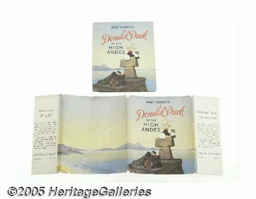 <B>Donald Duck in the High Andes with Dust Jacket (Artists & Writers Guild, 1943).</B></I> The excitable duck visits South America and meets with many hilarious adventures in this hardcover book, produced by the Artist & Writers Guild in 1943. Based on the Disney feature production, "Saludos Amigos," this 32 page book is filled with full color and black and white images along with a text story. There's just a bit of wear along the cover edges, and the dust jacket exhibits some tearing along the corners, but the cover color remains vibrant. There is the slightest trace of aging, but not as much as you would expect of a book that's over 60 years old! Overall this is a tight, clean copy in Very Fine condition. <I>From the Larry Jacobs Collection.</B></I>