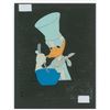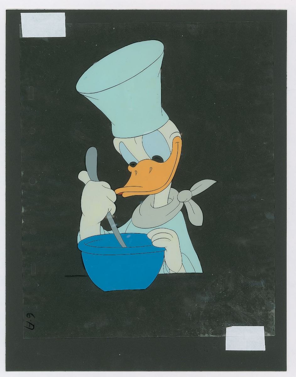 (Walt Disney Studios, 1941) Large original production cel from Chef Donald featuring Donald Duck baking. Image measures 5.5 x 9.5, with overall dimensions of 9.75 x 12.25. In fine condition, with some rippling to celluloid.