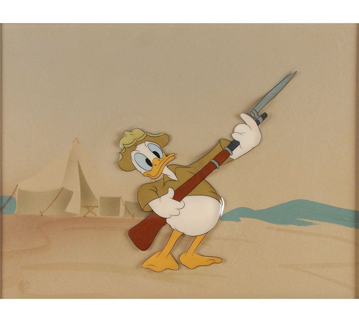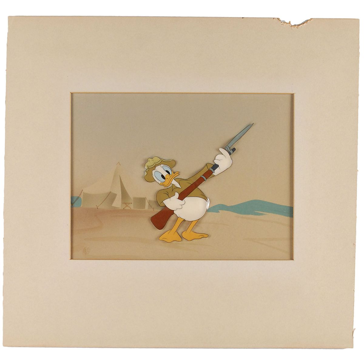 (Walt Disney Studios, 1942) Original production cel featuring Donald Duck from Donald Gets Drafted. The cel has been trimmed and applied to an airbrushed background as prepared by the Disney Studio to be sold at the Courvoisier Galleries. Image of Donald holding his rifle with bayonet measures 4.5 x 5.25, with a mat opening of 8.5 x 6.5. Mat dimensions are 13.75 x 13. The original Disney Courvoisier Galleries label is included. Rippling to cel and missing portion of top edge of mat, otherwise fine condition.