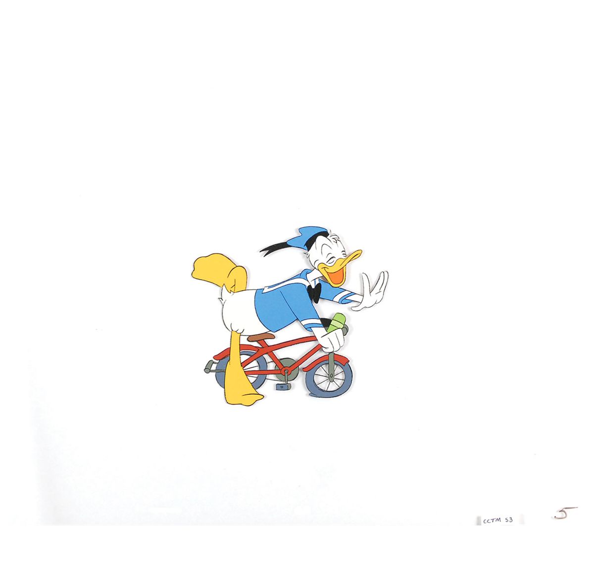 (Walt Disney Studios, 1960s) Original production cel featuring Donald Duck from a TV cartoon, showing him joyfully riding a bicycle. Image measures 5 x 4.5, with overall dimensions of 15 x 12.5. In fine condition.