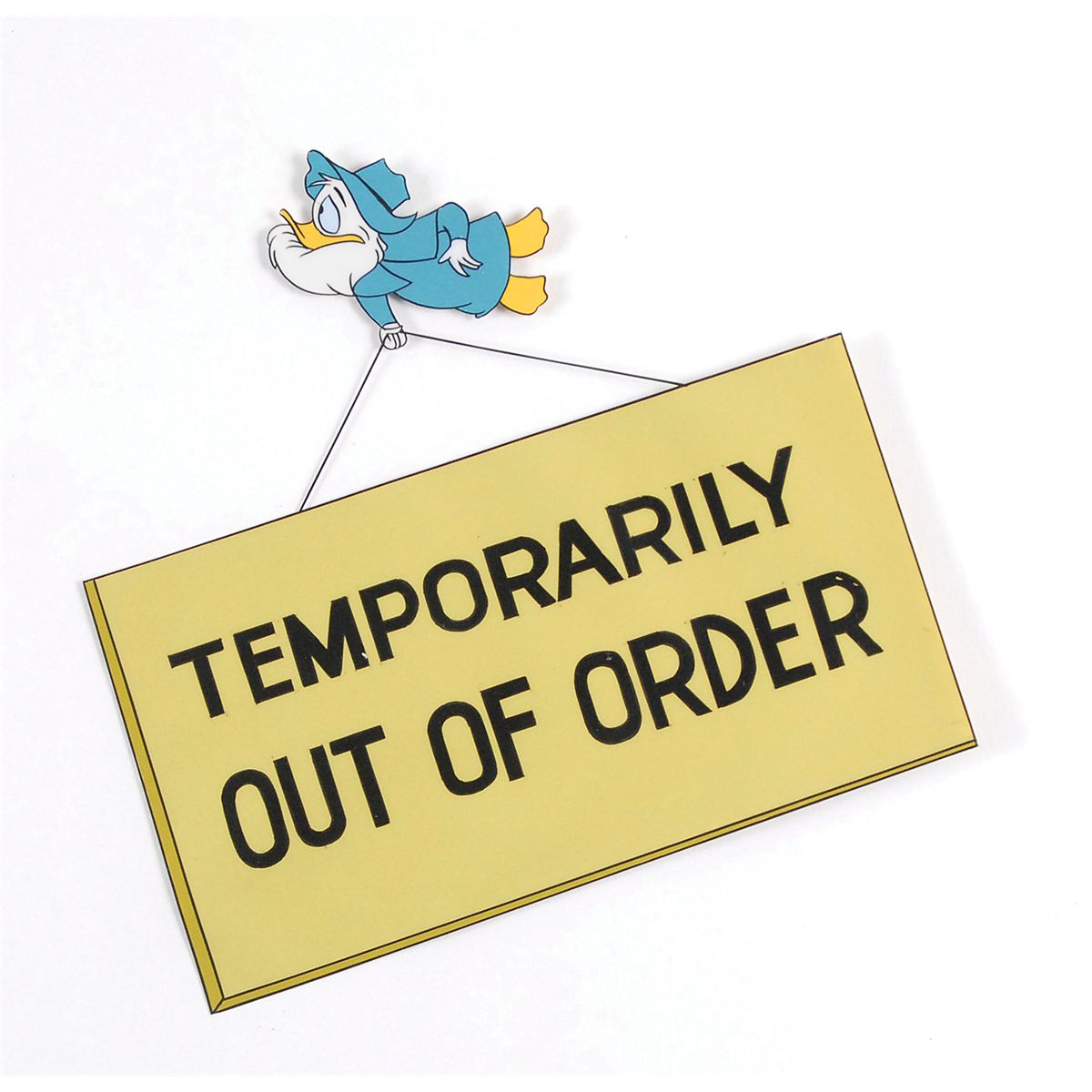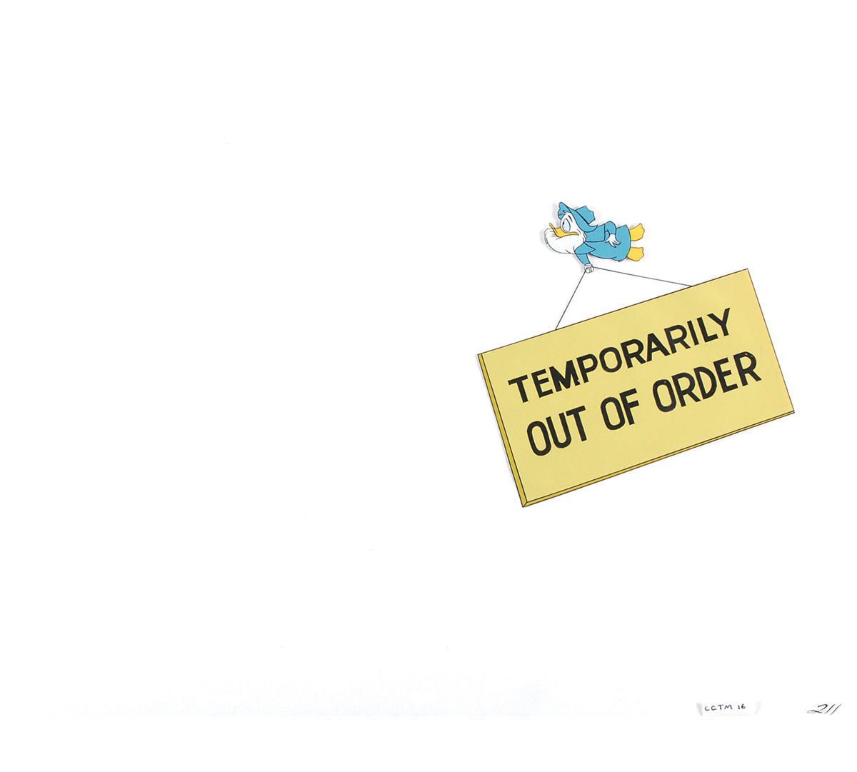 (Walt Disney Studios, Circa 1950s) Original production cel featuring Donald Duck from a Disney TV show, showing the character holding a “Temporarily Out of Order” sign. Image measures 6 x 5.5, with overall dimensions of 16 x 12.5. In fine condition.