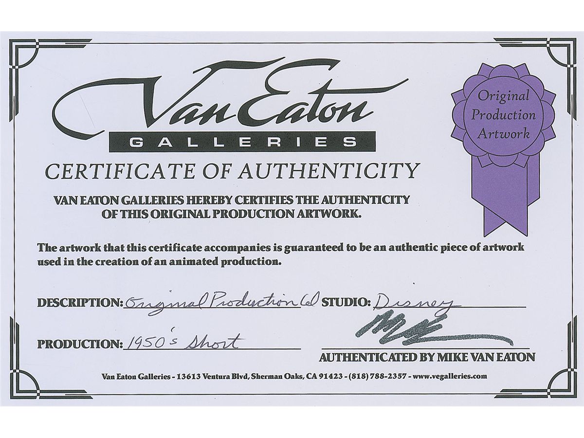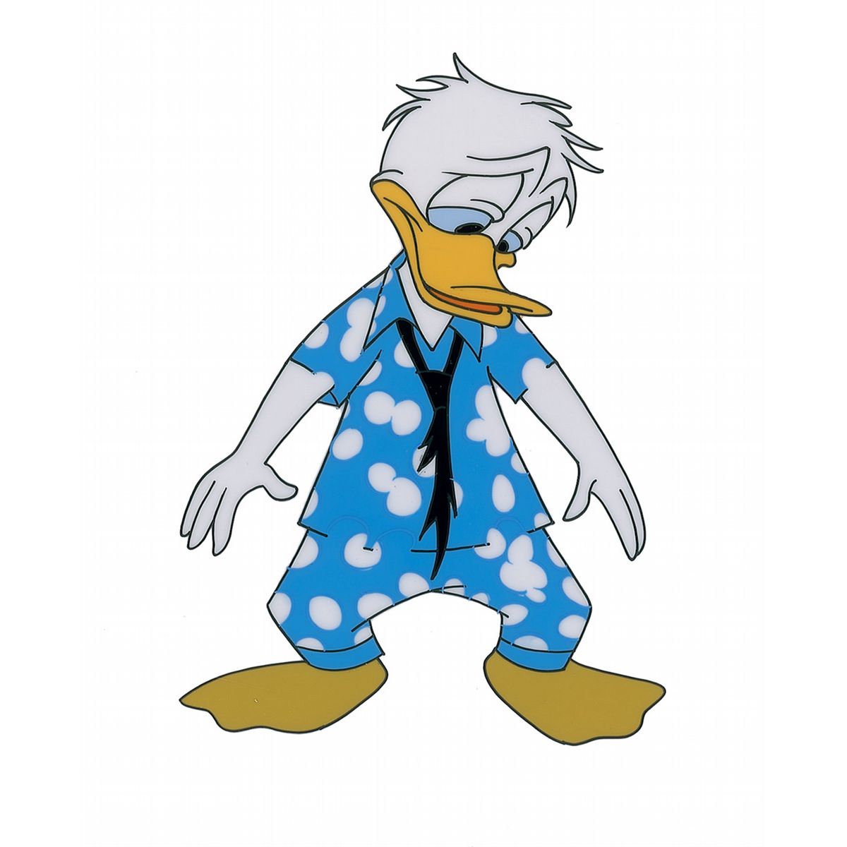 (Walt Disney Studios, Circa 1950s) Original production cel featuring Donald Duck from a Disney TV show, showing him in a very disheveled state. The cel is trimmed to 9.75 x 9. Image measures 3 x 4.25. In fine condition.