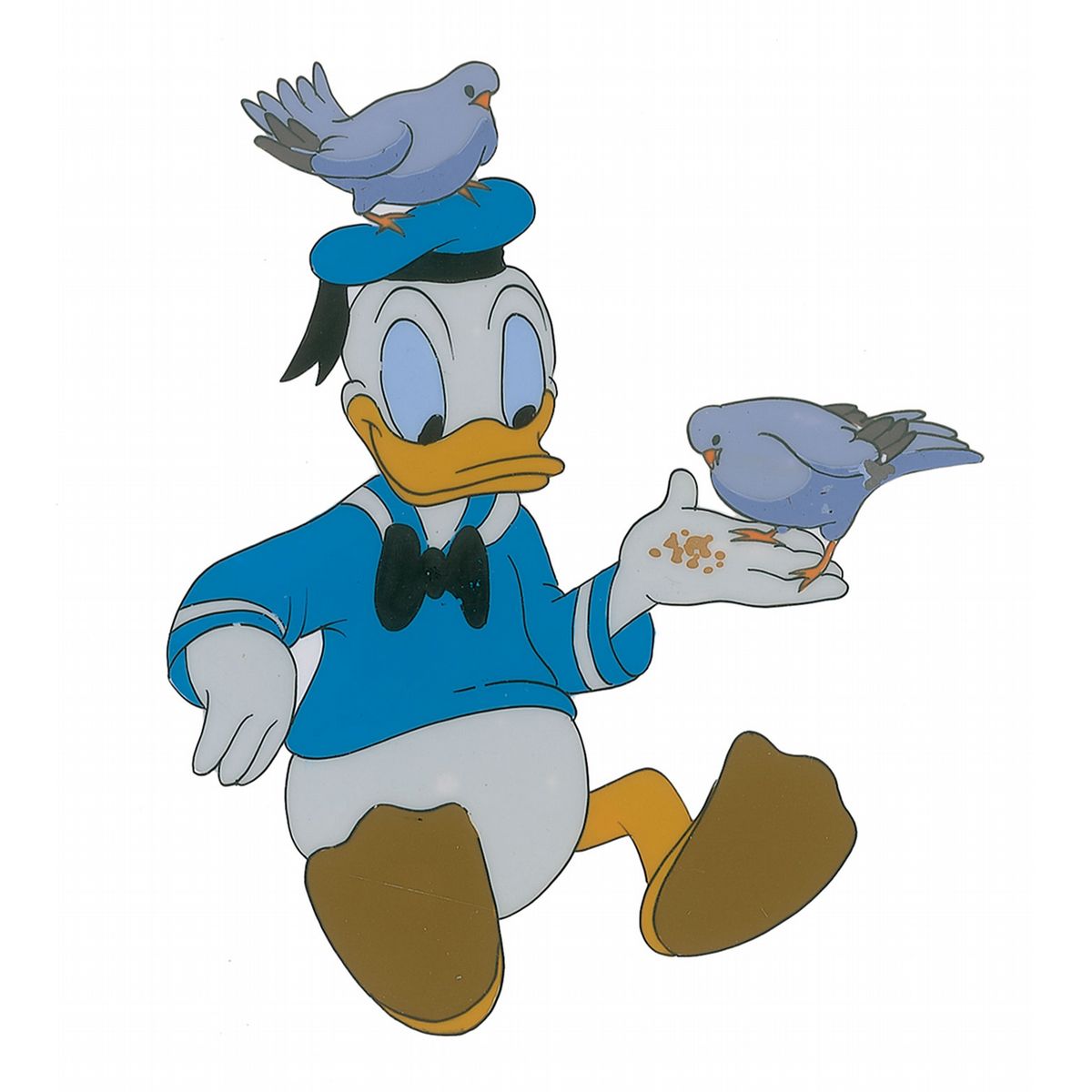 (Walt Disney Studios, early 1950s) Original production cel featuring Donald Duck from a theatrical short cartoon, showing him wearing his iconic sailor suit and feeding a couple of birds. The cel is trimmed to 9 x 7.25. Image measures 4 x 4.5. In fine condition.