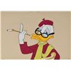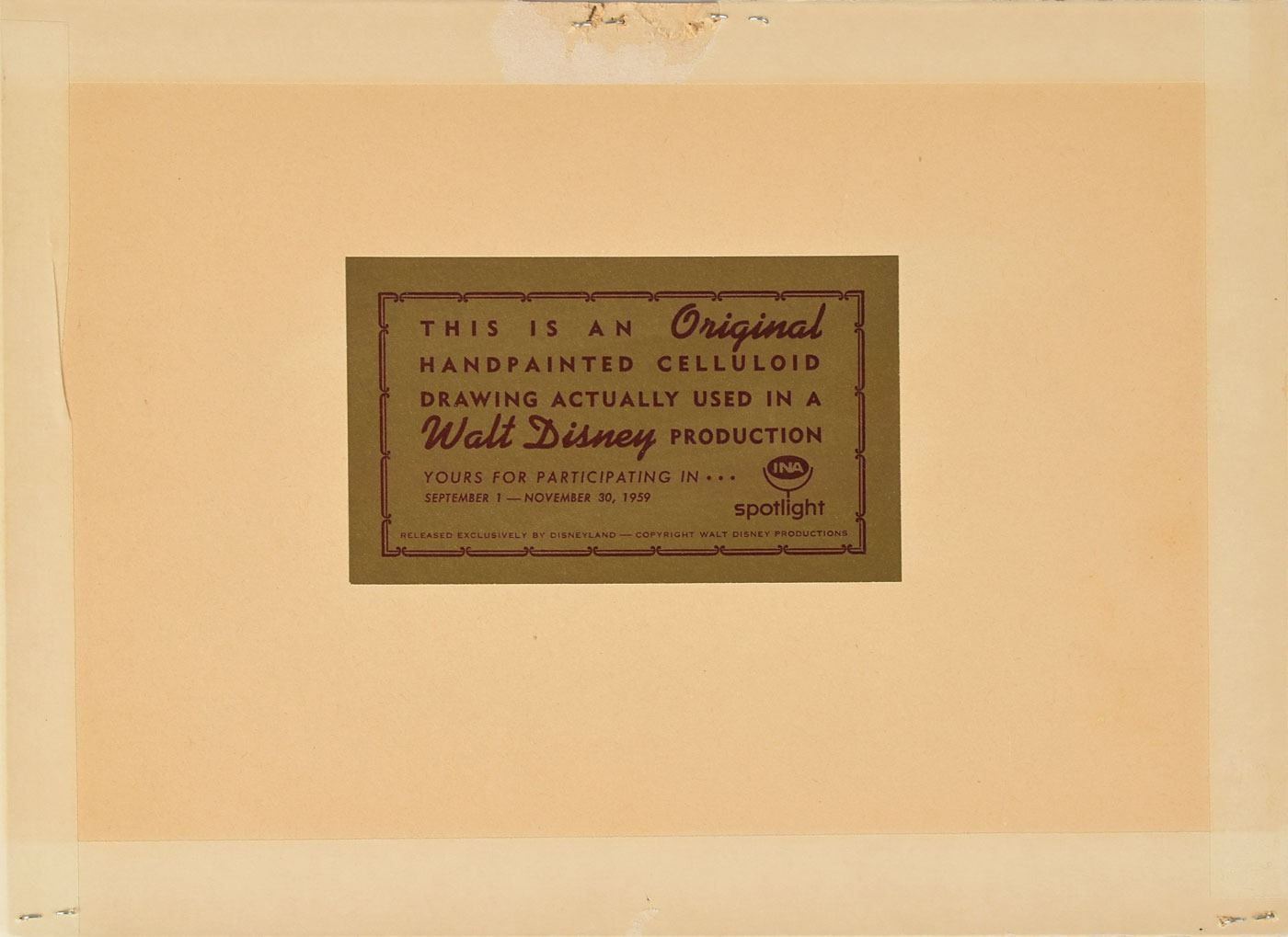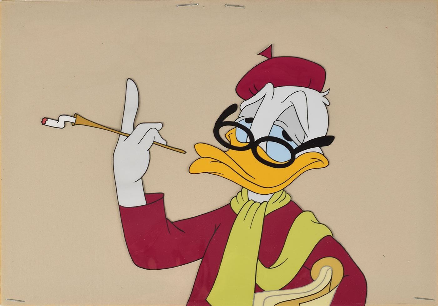 (Walt Disney Studios, circa 1950s) Original production cel featuring Donald Duck as a movie director from a Disney cartoon, showing him wearing a beret and holding a lit cigarette. Image measures 7.5 x 6.5. The cel is trimmed to 10 x 7.5 and stapled to its original backing, which bears a gold label on the reverse stating that this is an original hand-painted celluloid actually used in a Walt Disney production, and was released exclusively at Disneyland. In fine condition.