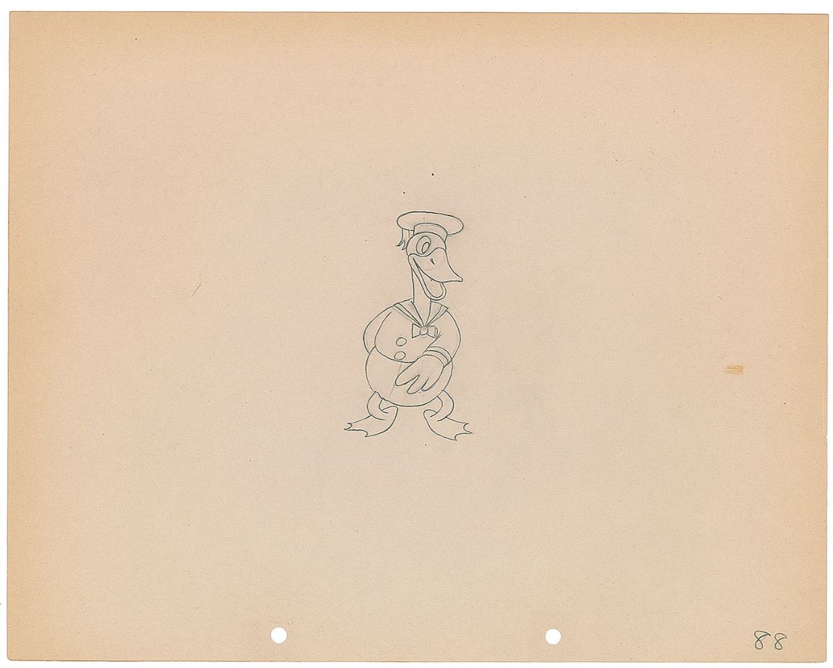 (Walt Disney Studios, 1934) Original production drawing featuring Donald Duck from Orphan’s Benefit, showing him in his classic sailor outfit. Accomplished in graphite on untrimmed 12 x 9.5 animation paper. Image measures 2 x 3.5. In fine condition. A fabulous, ultra-early depiction of this iconic character.