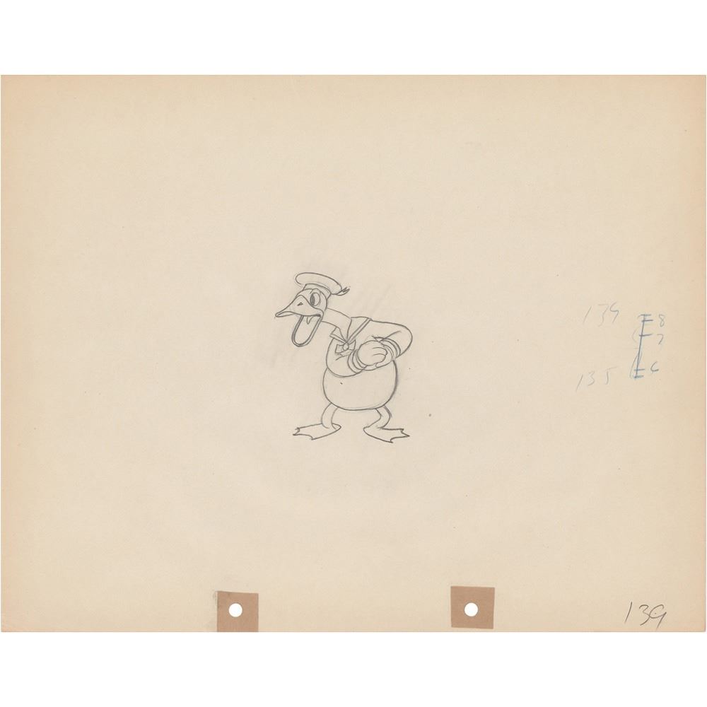 (Walt Disney Studios, 1934) Original production drawing of Donald Duck from Orphan's Benefit, which shows the quacking duck in an early full-length pose. Accomplished in graphite on untrimmed 12 x 9.5 animation paper marked "139" in the lower right corner. Image measures 2.25 x 2.75. In fine condition, with small tears to the top and bottom edges. Released as a black-and-white cartoon in 1934, Orphan's Benefit marked the second film appearance of Donald Duck, and his very first joint appearance with Mickey Mouse. A desirable ultra-early portrayal of a classic character.